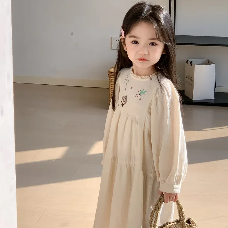 Spring Autumn Baby Girl Floral Embroidery Cotton Long Sleeve Formal Princess Dress for Children