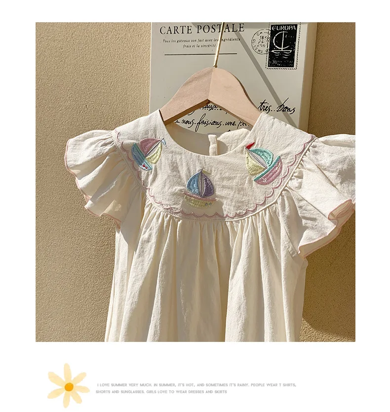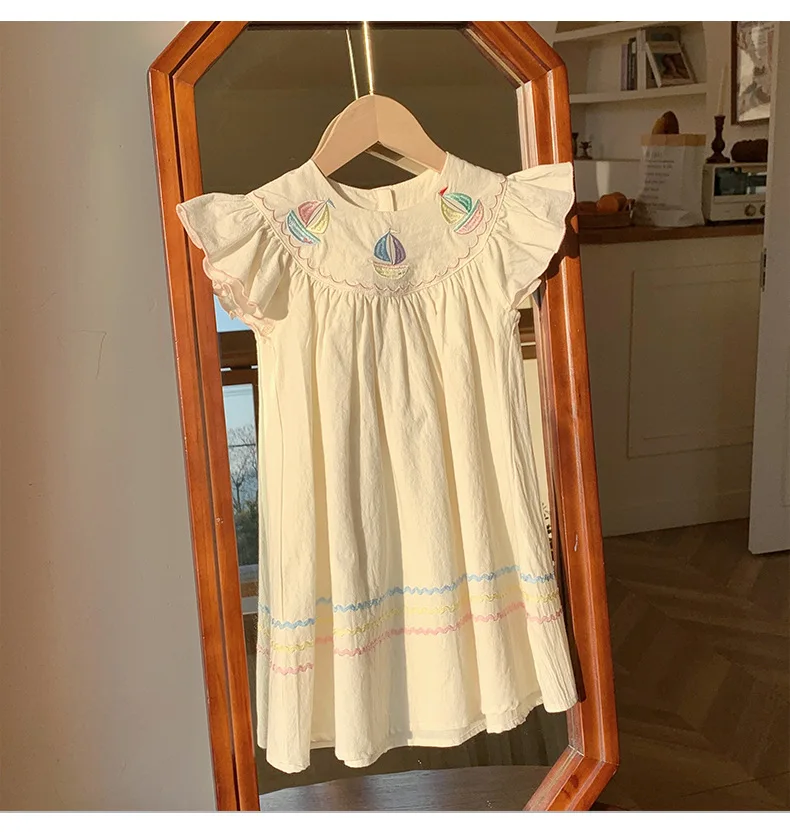 Rainbow Sailboat Design Embroidered Girls Dress Summer Short Sleeve Children's Linen Cotton Blended Girl Dress
