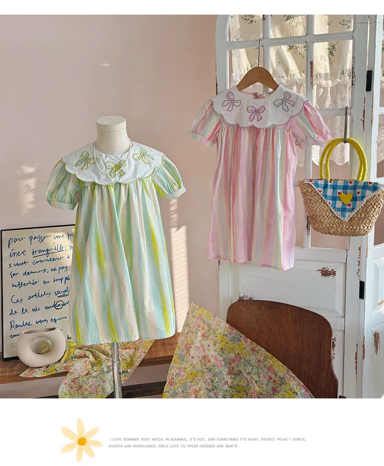 Summer Korean Style Girls' Sweet Princess Dress Collar Bow Embroidered Dresses Short Sleeve Colorful Striped for Children