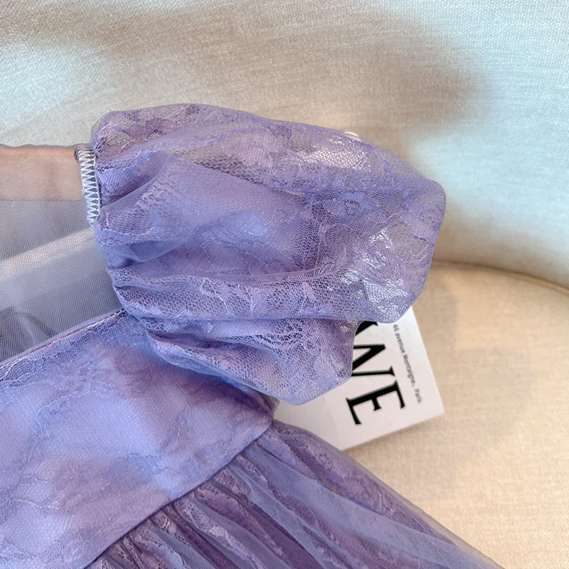 Girls' Princess Dress Korean Style Puff Sleeve Pearl Round Square Collar Lace Dress Children Birthday Piano Performance Dress