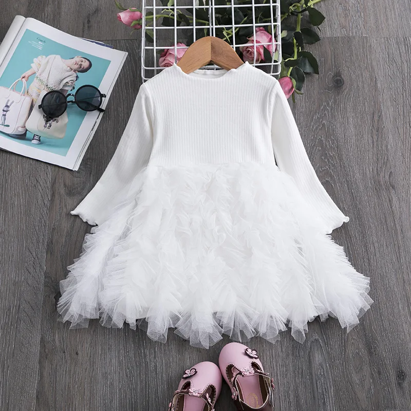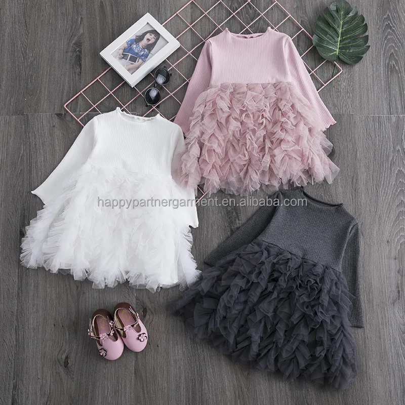 Wholesale Customizable Girls Tulle Dress Long Sleeve Pink Cake Skirt Chiffon Fabric Layered Silhouette Skirt for Children 2-14T