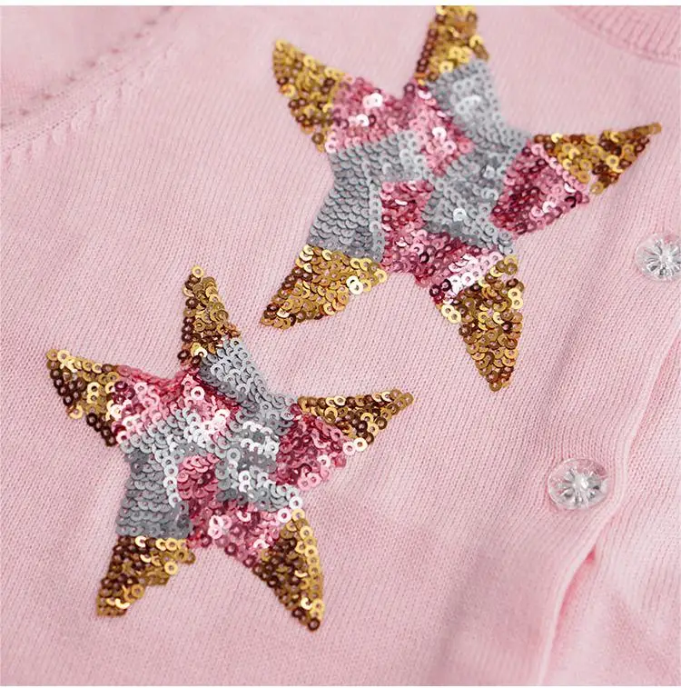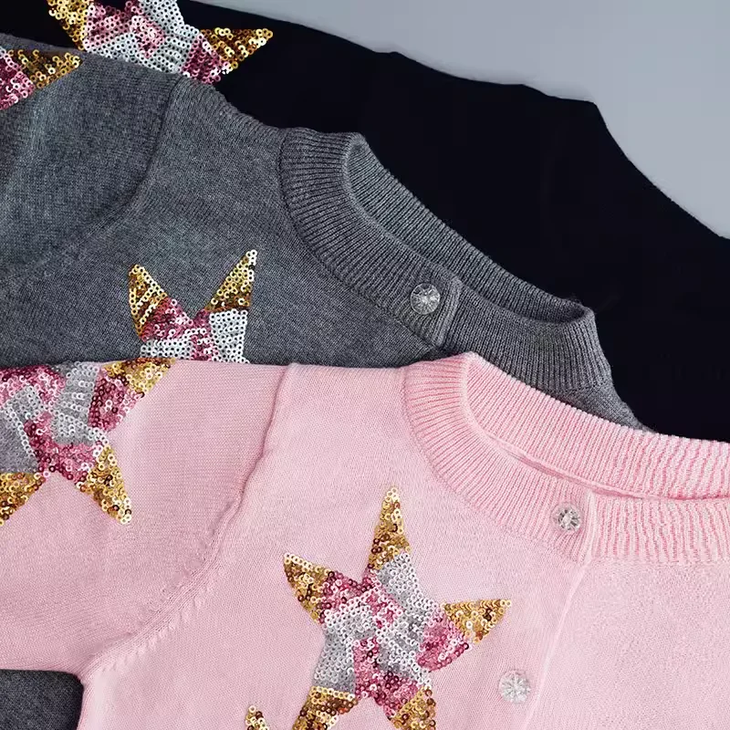 Customized Kids Knitted Cardigan Jacket Sequin Star Embroidered Girls Sweater for Winter