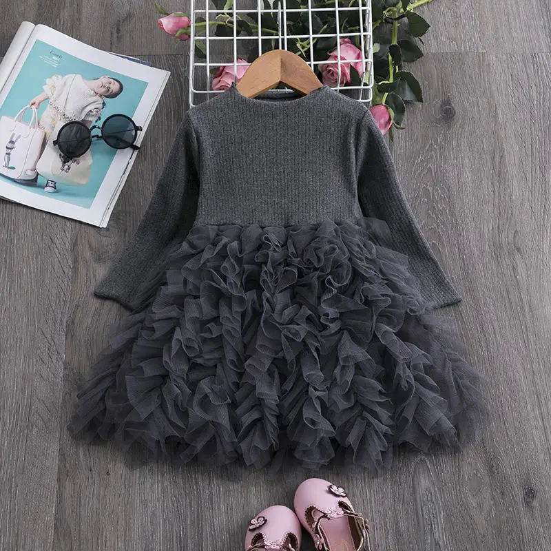 OEM Customized Long Sleeve O-Neck Cake Skirt Summer Tulle Chiffon Breathable Girls Dress