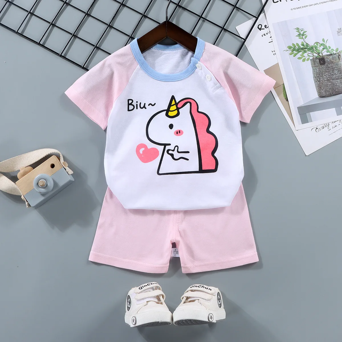 Customizable Hot Style Boys' Casual Suit O-Neck Shoulder Buttons Cartoon Printing Boys Clothes Set
