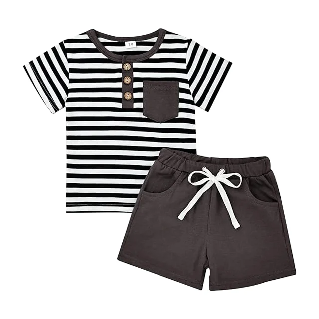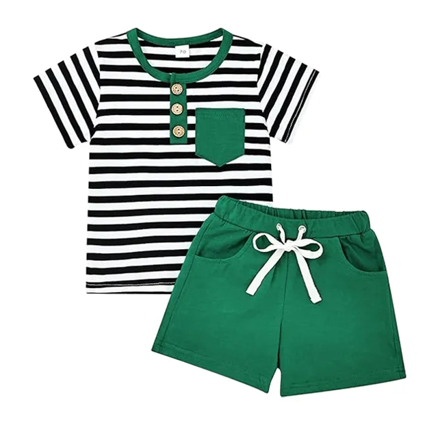 OEM ODM Customizable Boy's Summer O-Neck Strip Printing T'shirt Top Shorts 2 PCS Kids Clothing Set