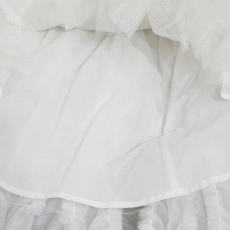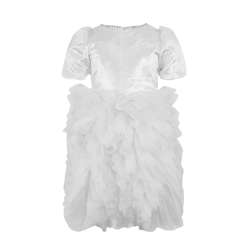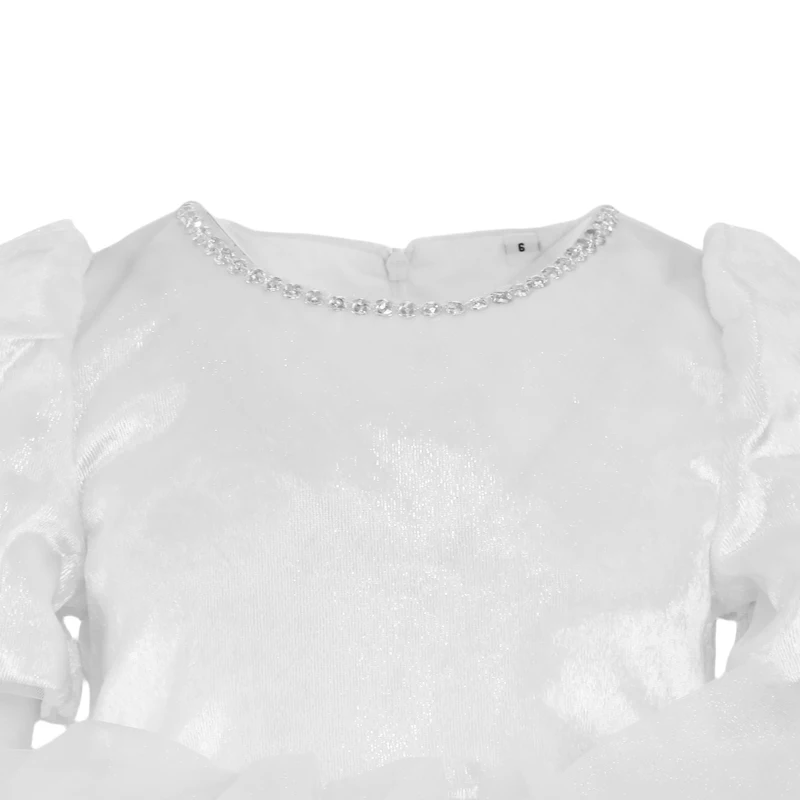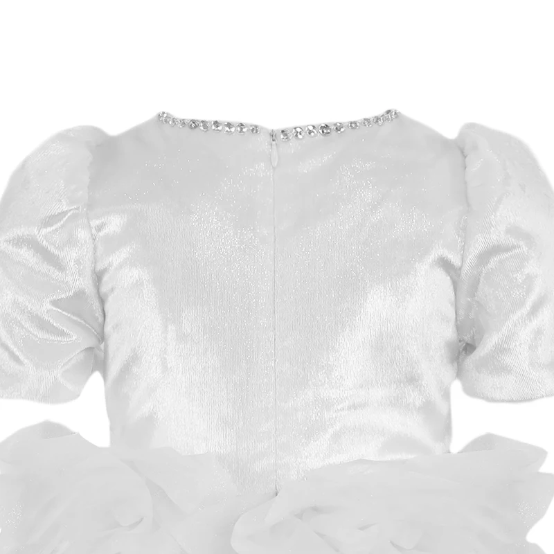 Customizable White Shiny Girls Dress Puff Sleeves Rhinestone Neckline Ruffled Tulle Skirt for Special Occasions