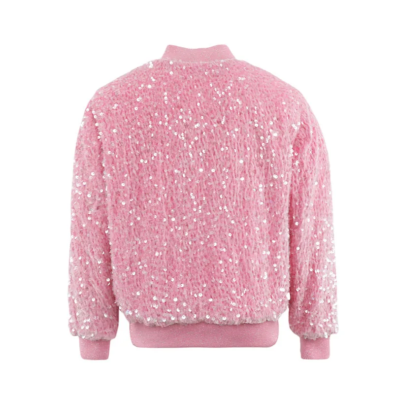 Customizable Girls Pink Faux Fur Sequin Bomber Jacket Soft Shiny Kids Fashion Outerwear for Casual Wear