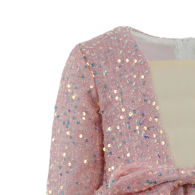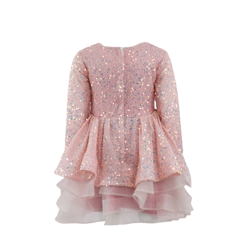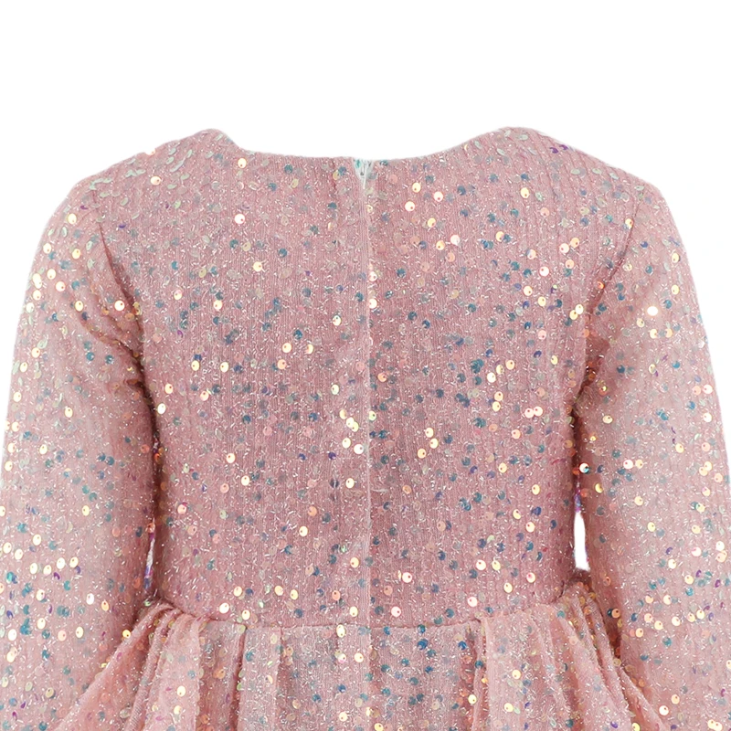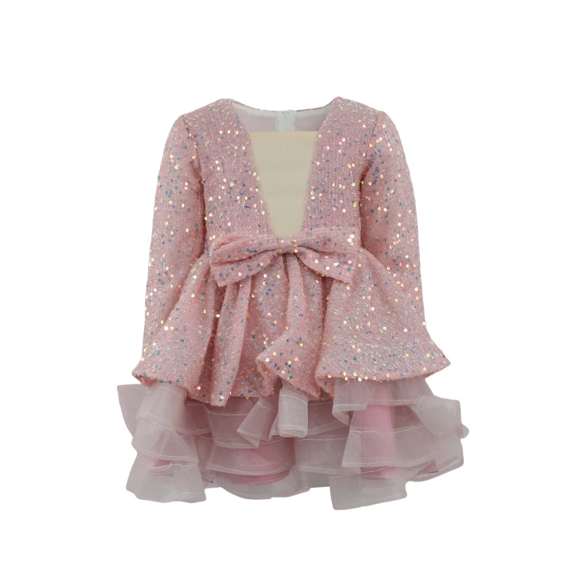 Exquisite Pink Sequin Embellished Girls' Dress Ruffled Tulle Detail Chic Bow Dress for Festive Occasions