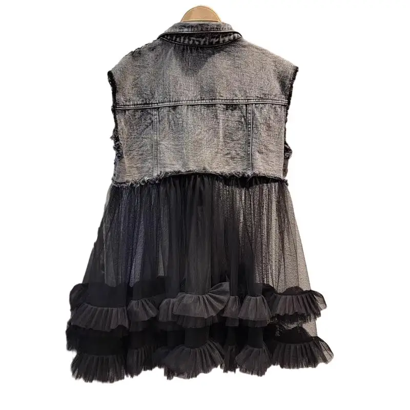 Customized Heavy Beading Denim Jacket Splicing Mesh Vest Retro Cardigan Jacket for Kids