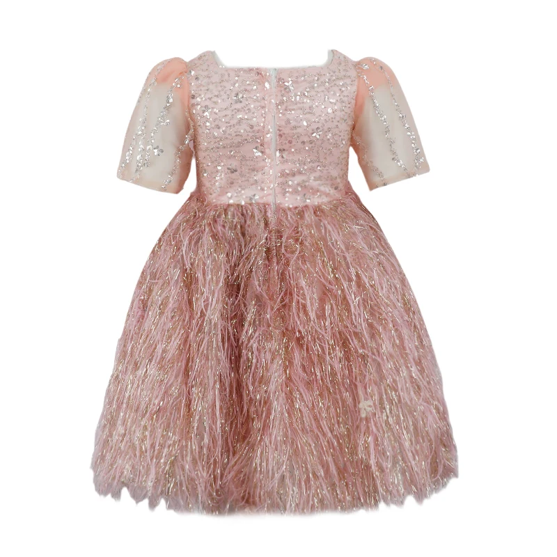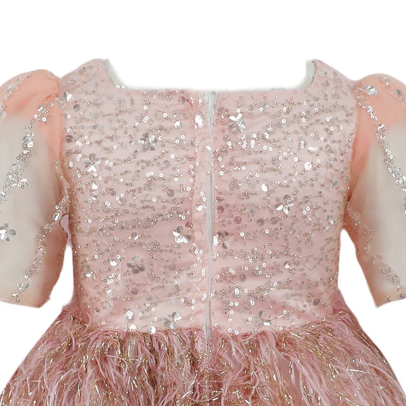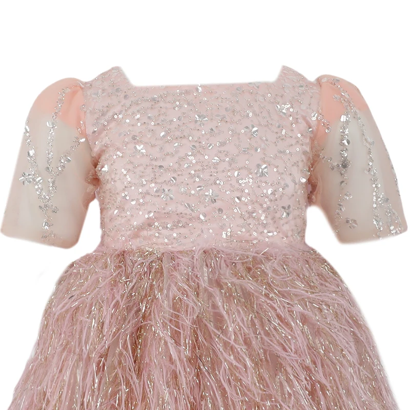 Customizable Charming Pink Short Puff Sleeve Girls Dress Sparkling Sequin Summer Princess Dress