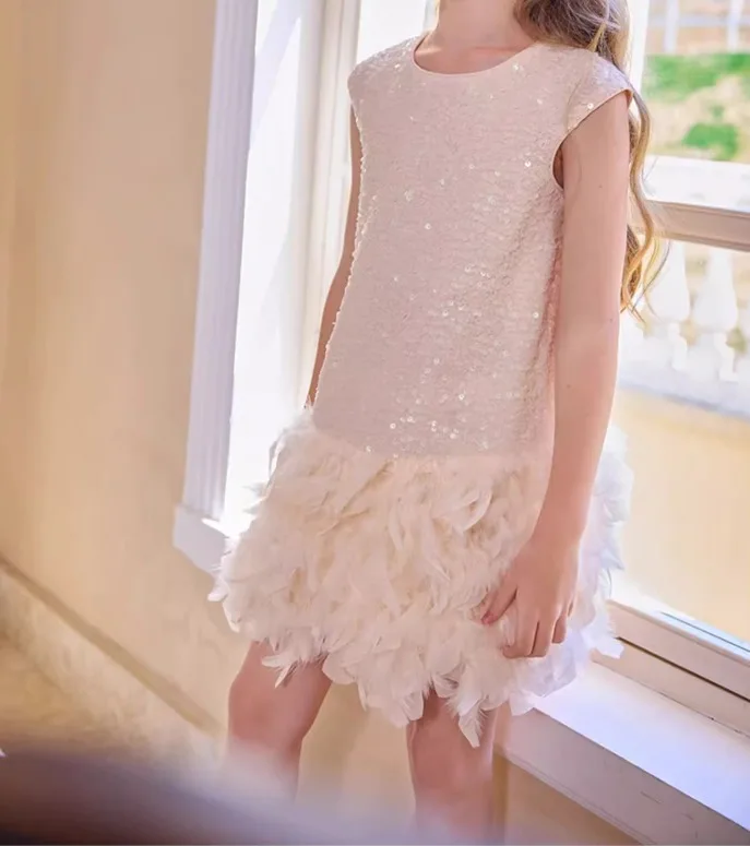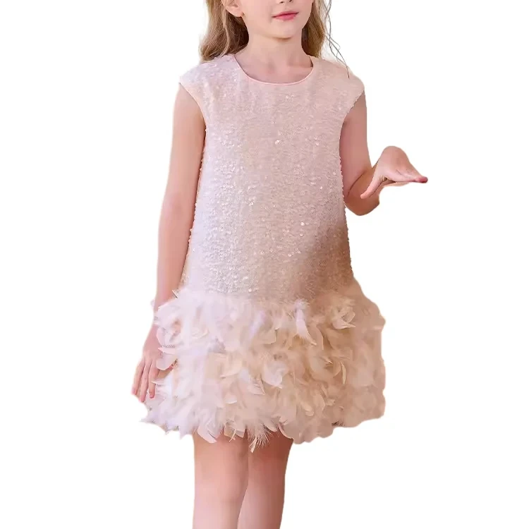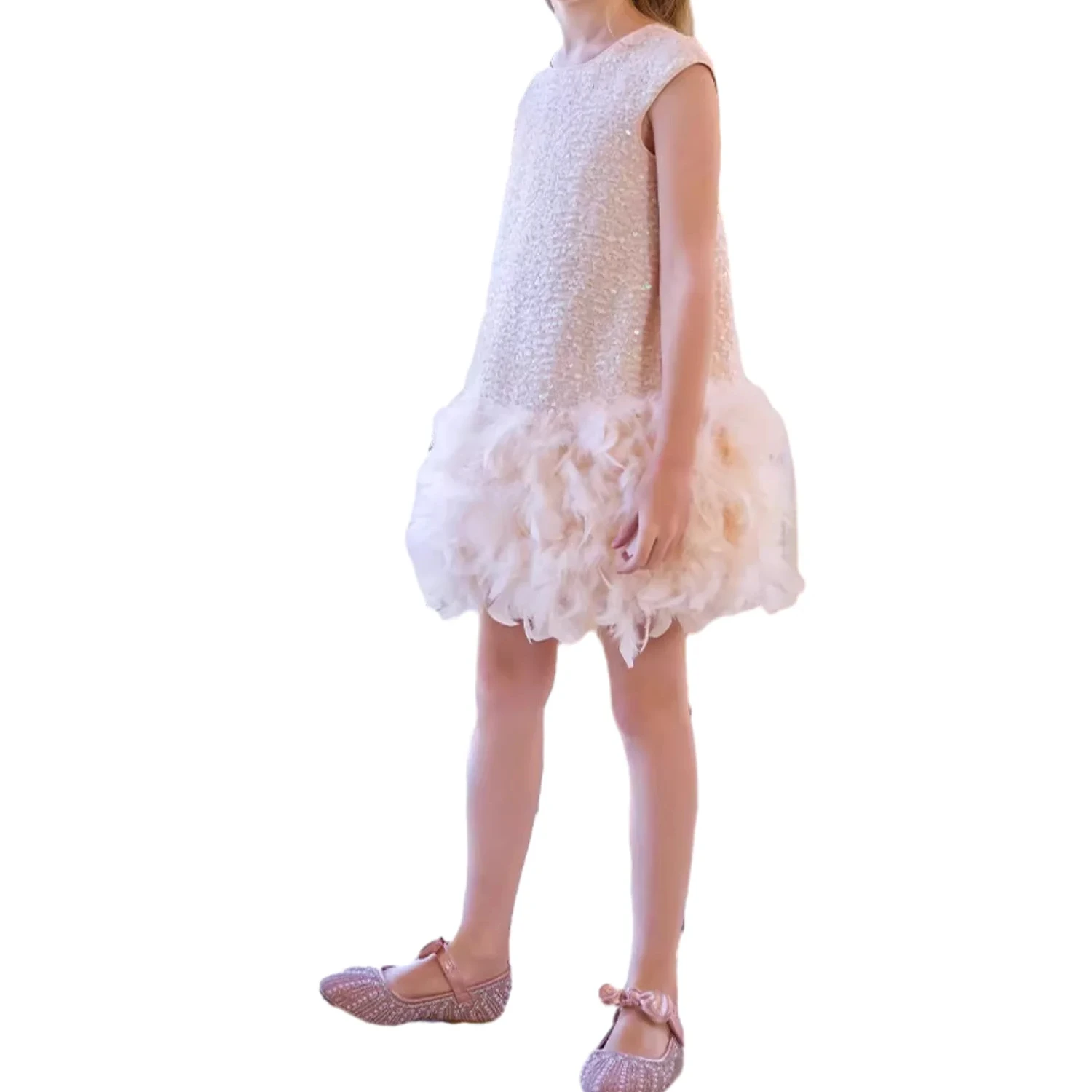 High Quality Girls Summer Sleeveless Sequin Feather A-Line Dress for Birthday Party
