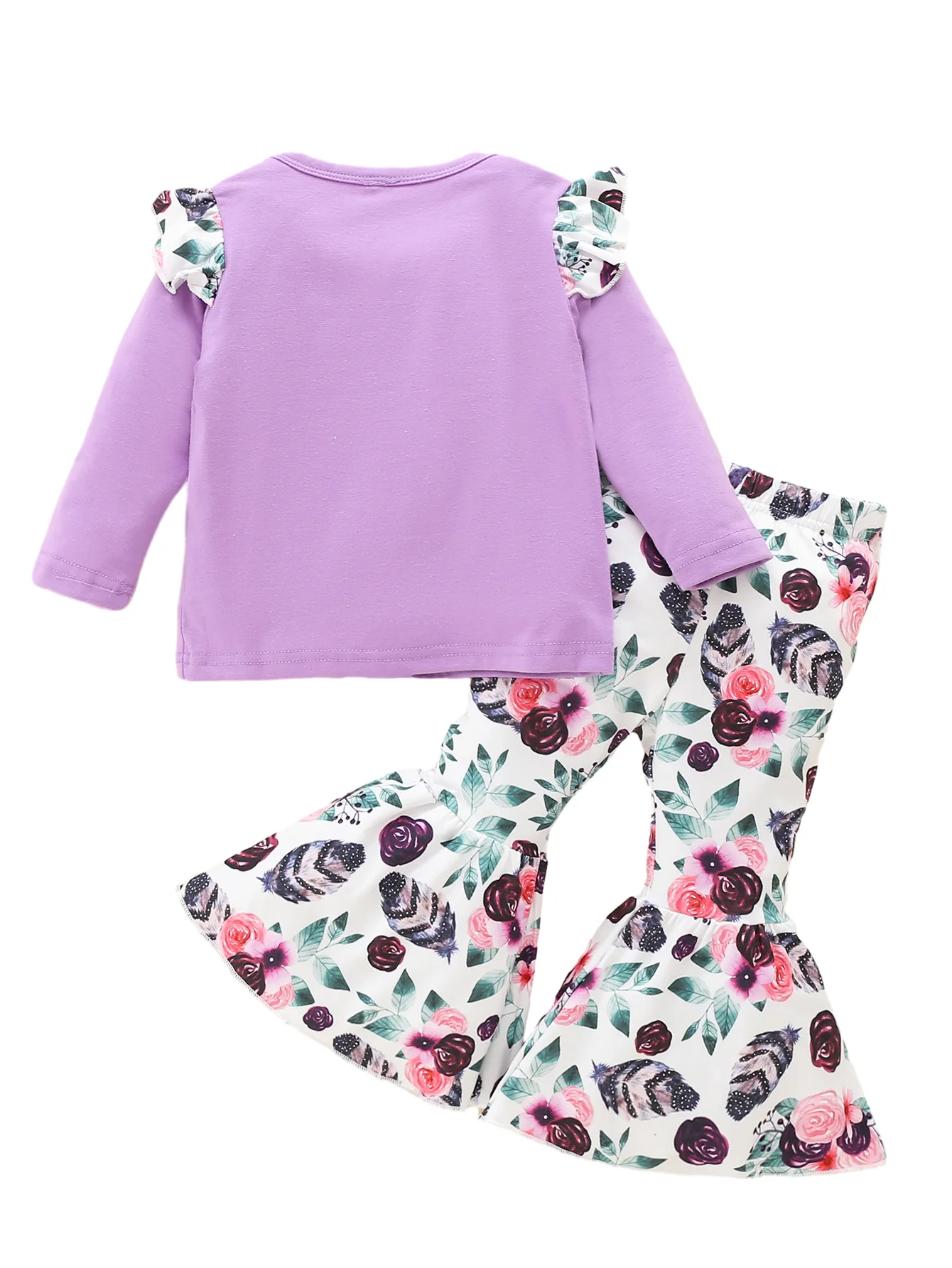 Mother's Day Cute Girls Clothing Sets Ruffle Sleeve Sweatshirt Floral Printed Flared Trousers Children Clothing Sets