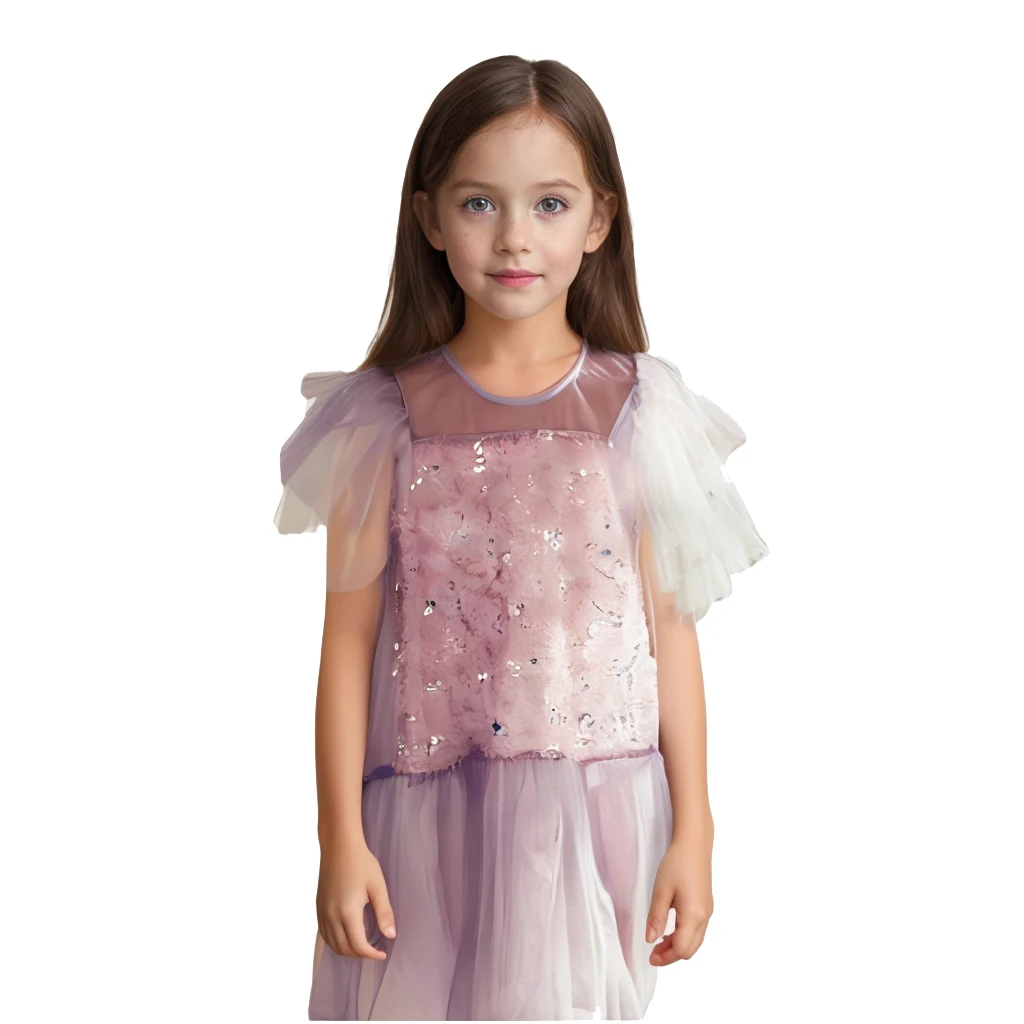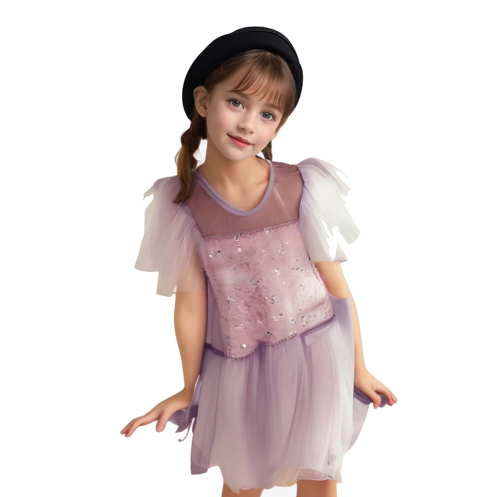 Customizable Wholesale Sweet Purple Ruffle Sleeve Sequined Girls Princess Dress Tulle Dress for Summer