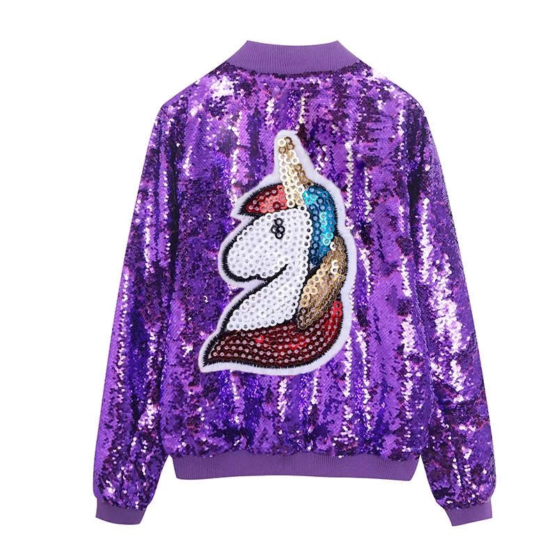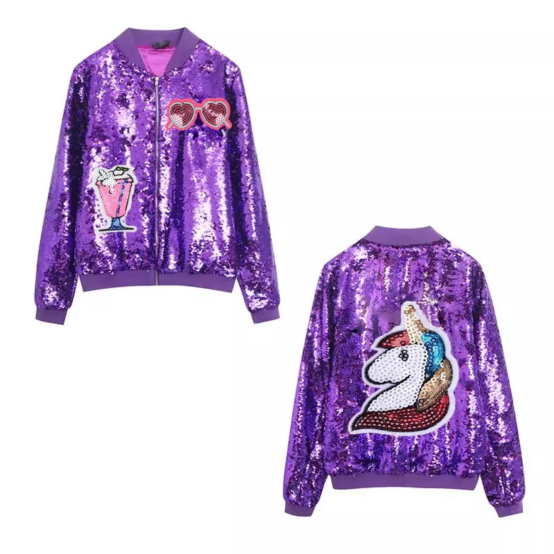 New Fashion Custom Patches Unicorn Girls Sequined Bomber Jacket for Autumn and Winter