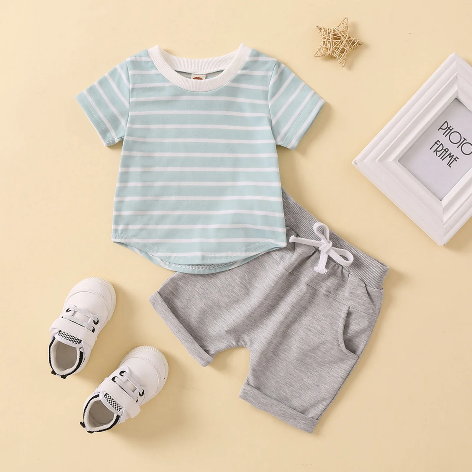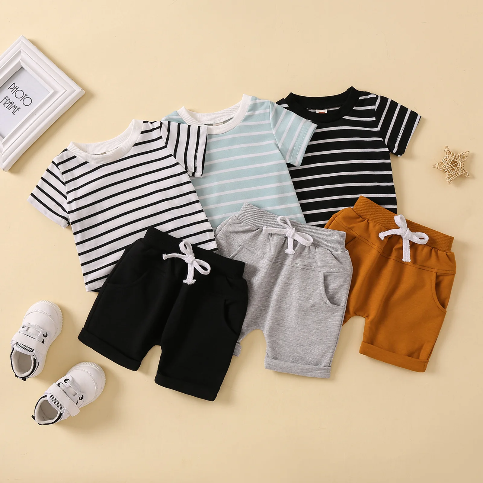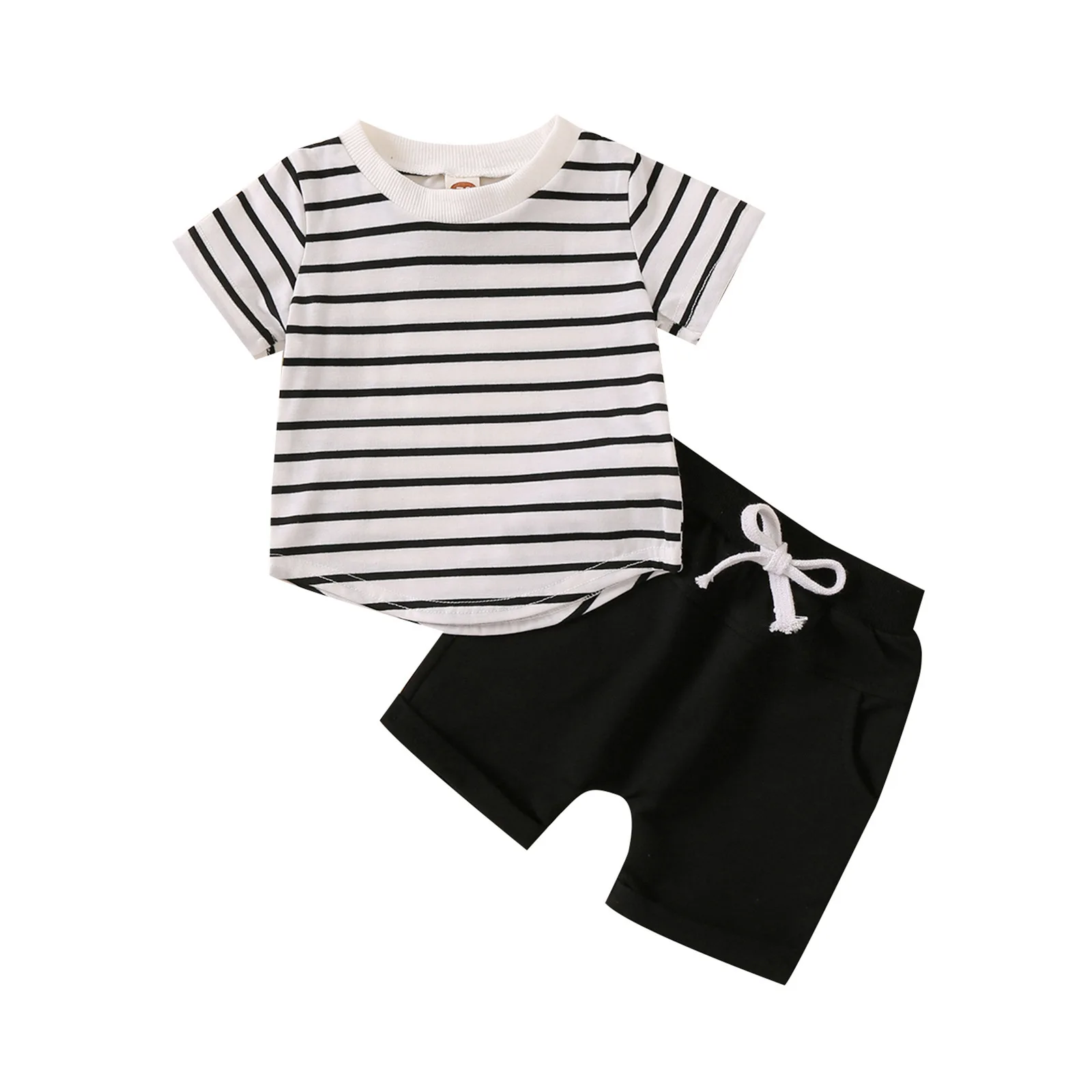 Customizable Summer Boys Striped Simple Style Round Neck T-shirt Shorts Two Pieces Kids Clothing Sets