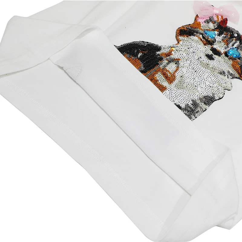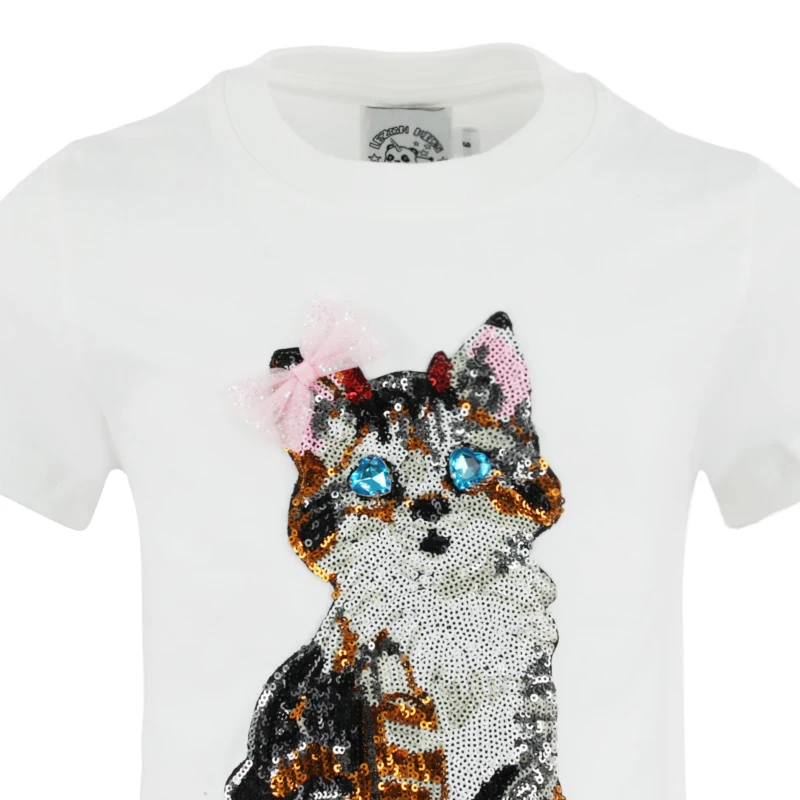 Custom Girls Cat Pattern T-Shirt Short Sleeve Cotton Kids Clothing O-Neck Collar Sequined Patches Printed T-Shirt