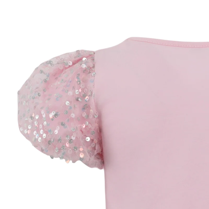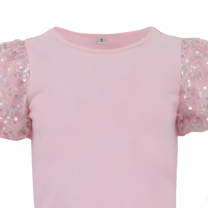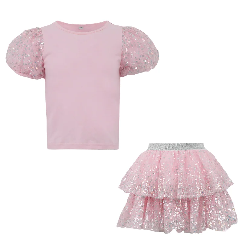 Customizable Girls' Clothing Set Solid Color Sequin Mesh Multilayer Ruffled Top Cake Skirt Girls' Suit with Glitter Decoration