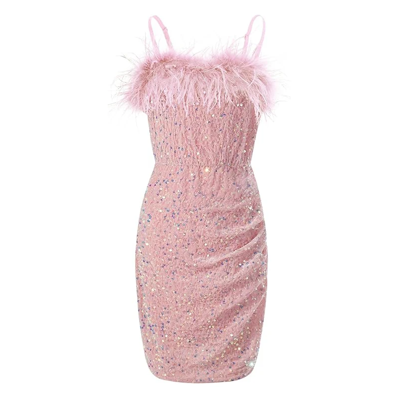 Girls Pink Sequins Feather Sling Dress O-Neck Polyester Straight Silhouette Summer Birthday Party Dress
