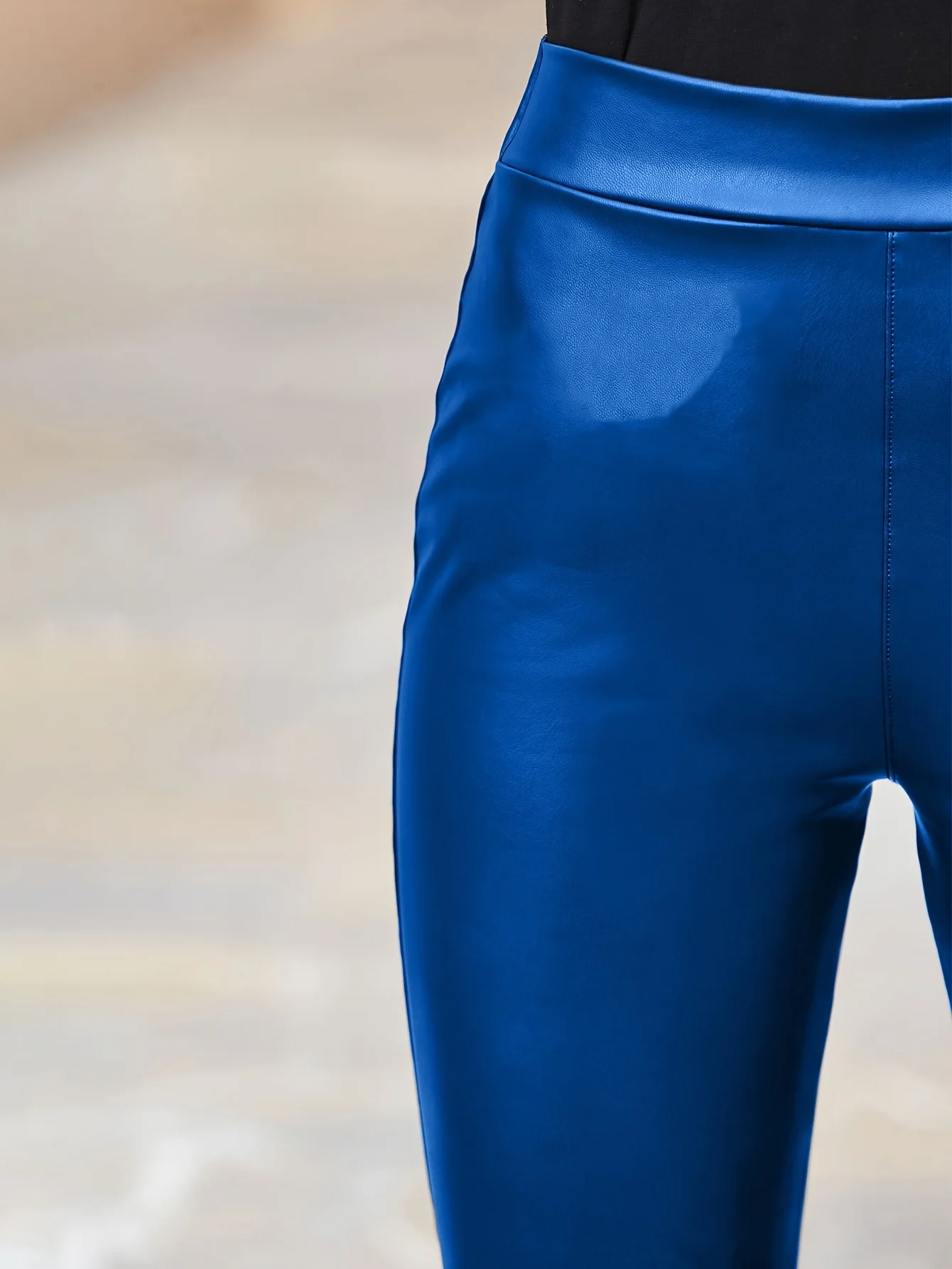 Blue Versatile Water-Based PU Pure Environmentally Friendly Artificial Leather Tights Slim Solid Color Elastic Waist Loose Pants