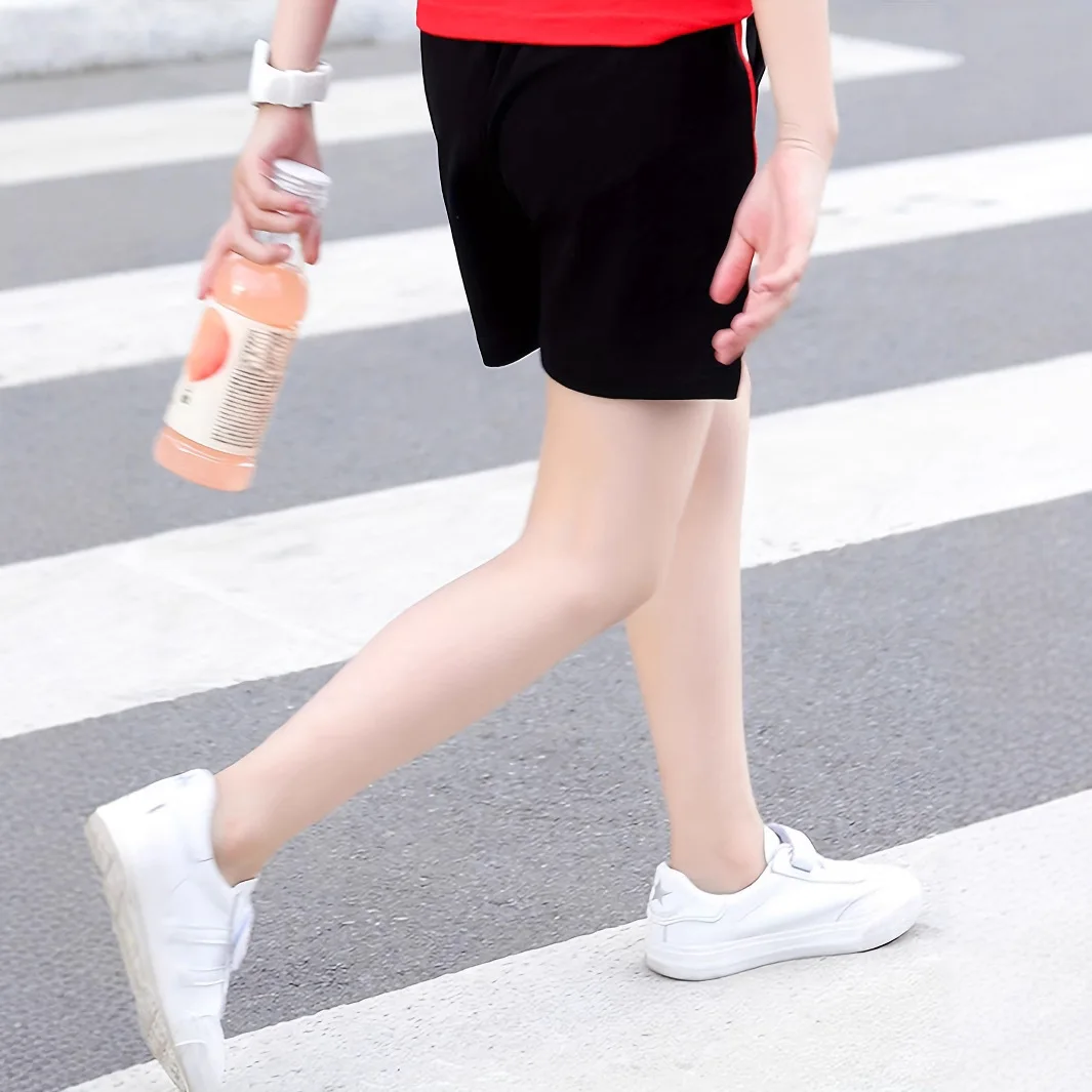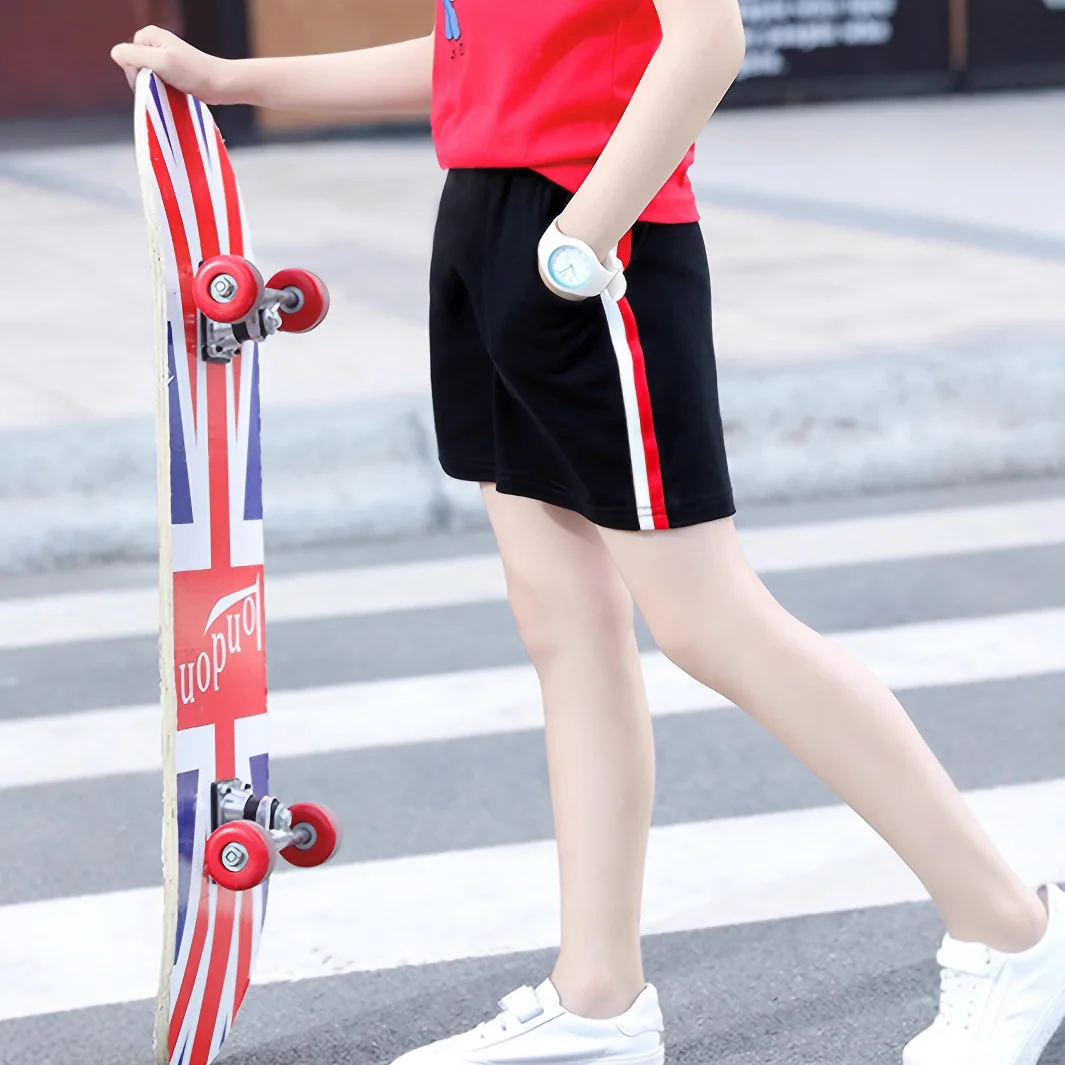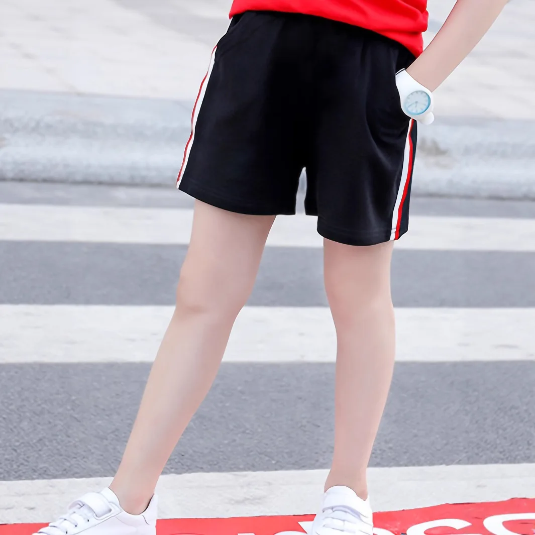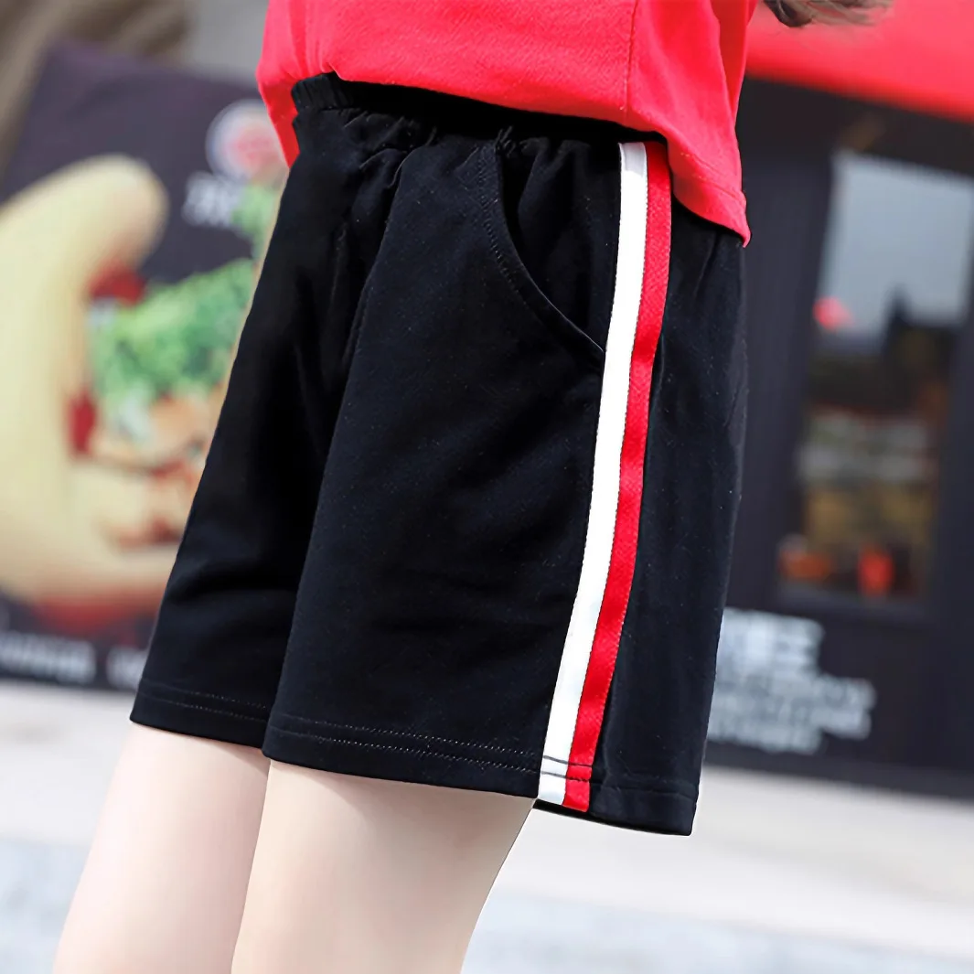 Summer New Girls Elastic Waist Red Striped Casual Outer Sports Shorts Breathable for Middle and Large Children