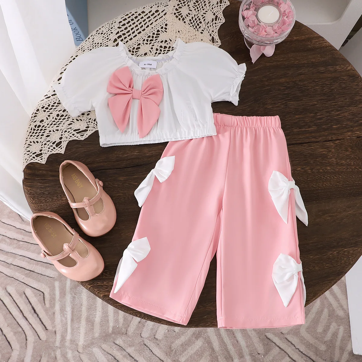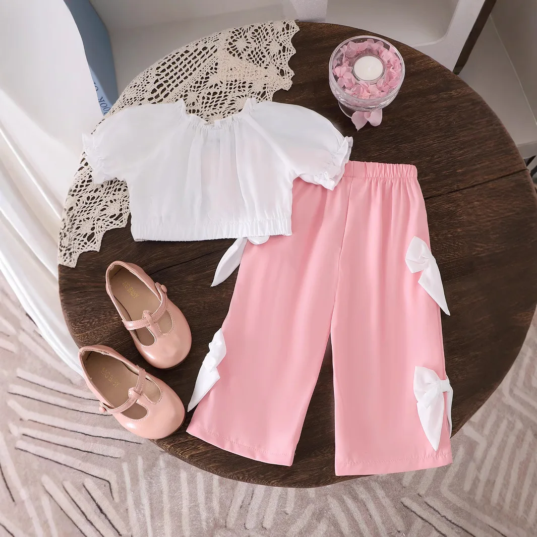 0-3Y Girl Clothes Pink Set Super Bows Casual Short Puff Sleeve Wide Leg Pants 2Pcs Kids Outfits Summer Clothes for Kids