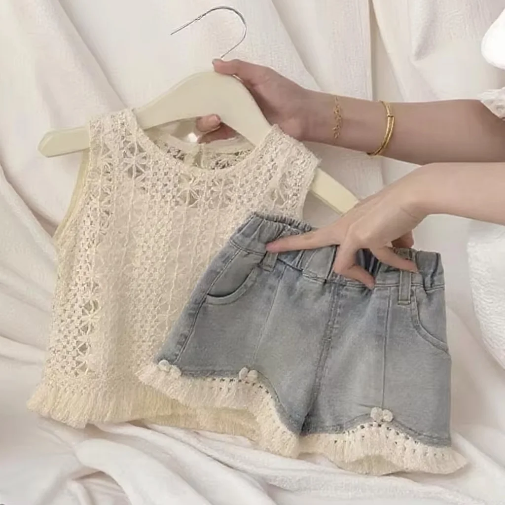 Girls Summer Suit New Korean Casual Style Women's Treasure Summer Hollow Vest Sling Top Jeans Two-Piece Set Clothes for Kids