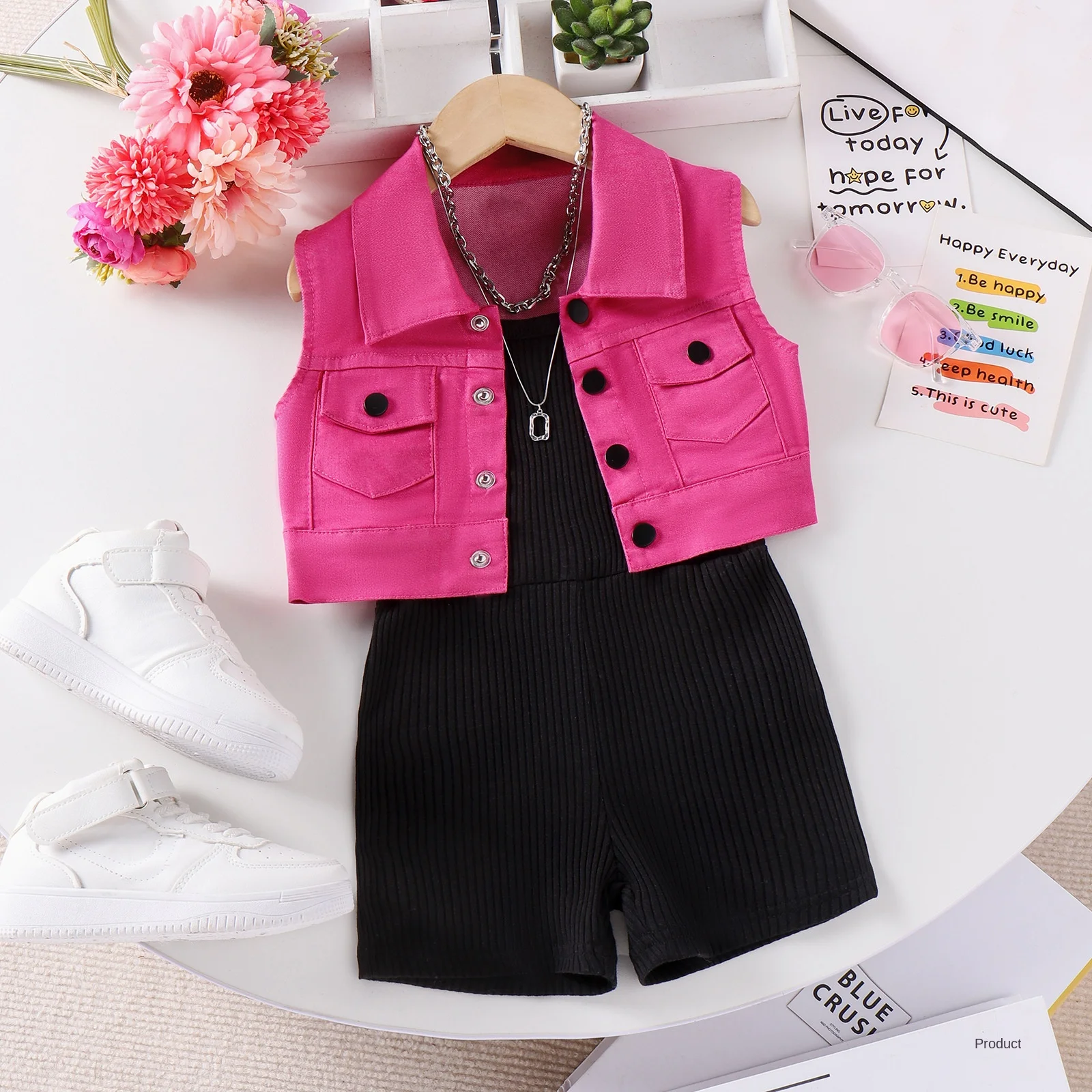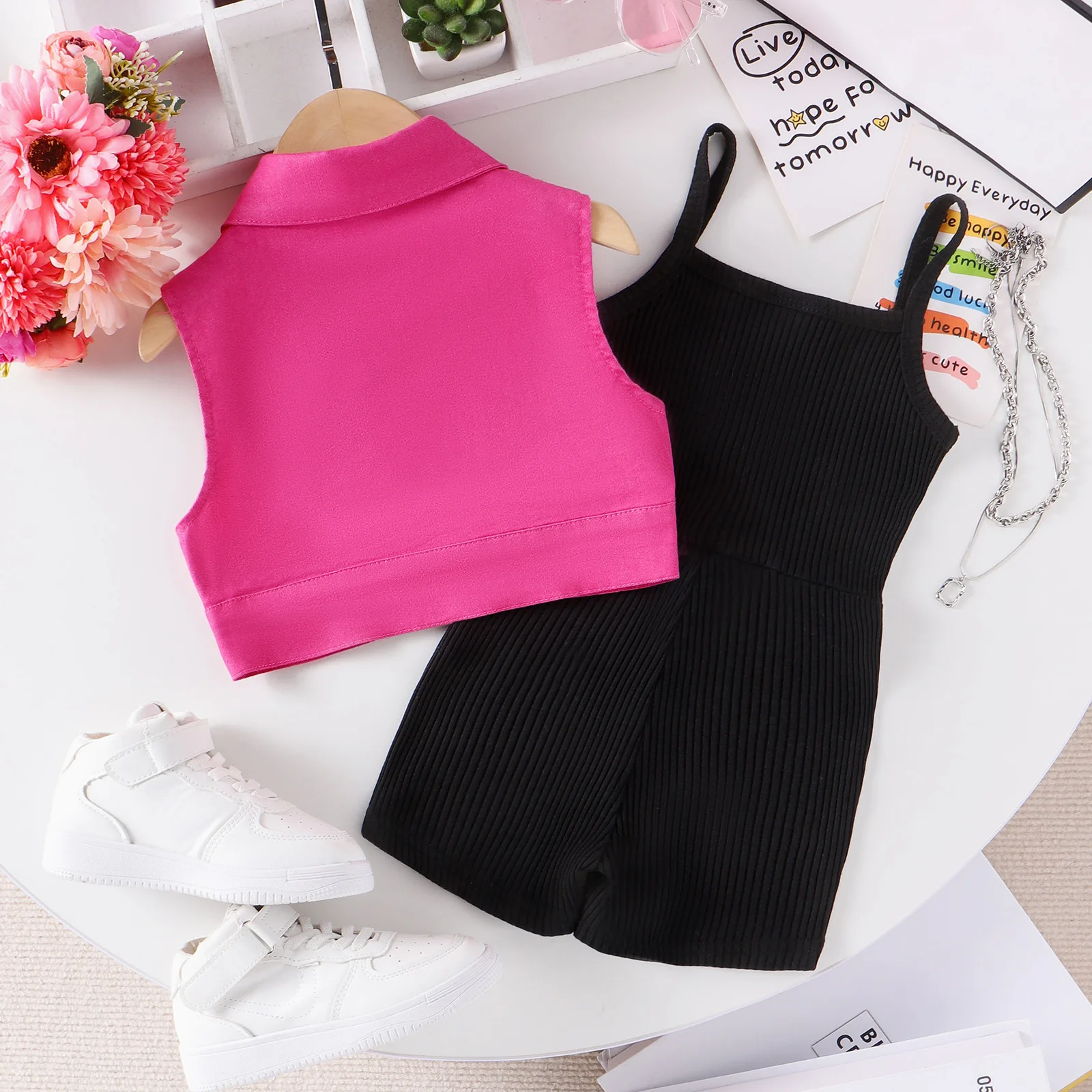 Children's Daily Wear Sleeveless Coat Strap Jumpsuit Black Dress Two Pieces Kids Casual Summer Toddler Girls Clothes for Kids