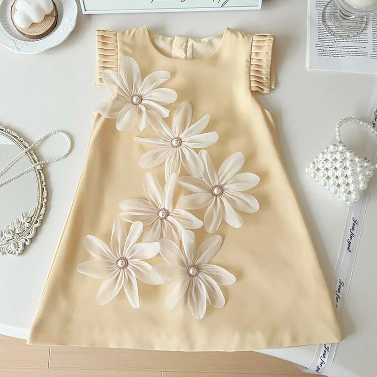 Summer Kids Clothing Fashion New 3D Flower Pleated Flying Sleeve Princess Dress Girl Beautiful Dresses 2-11y Clothes for Kids