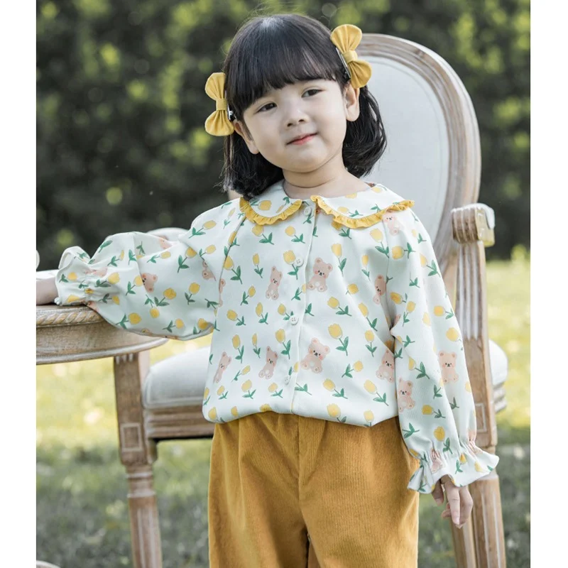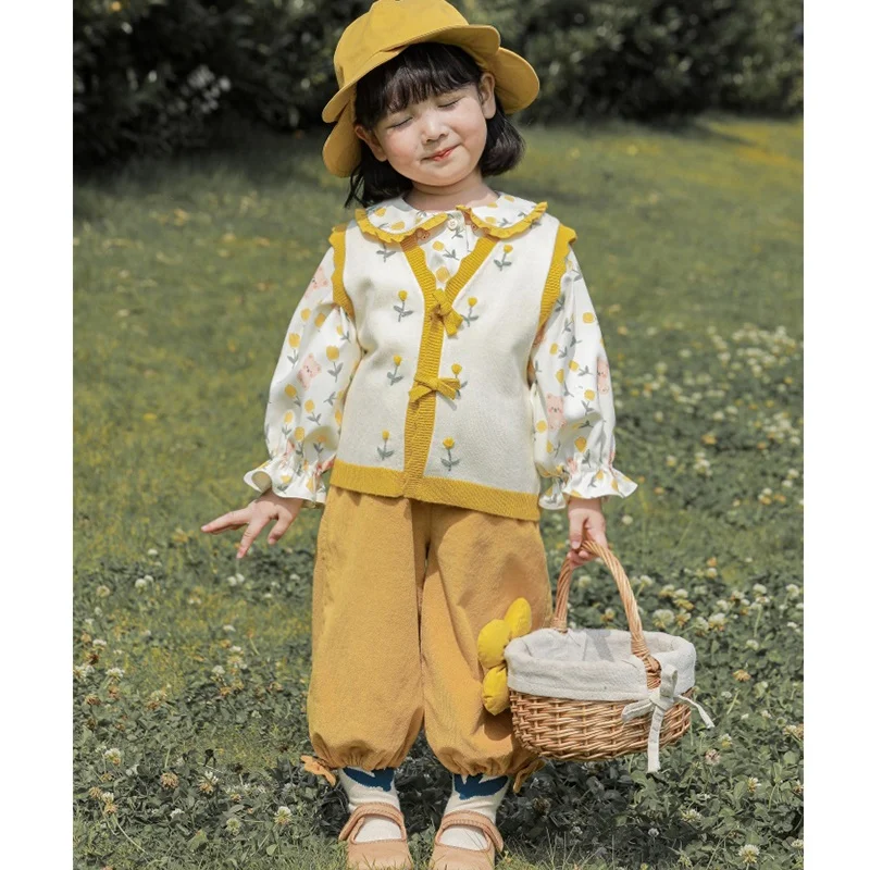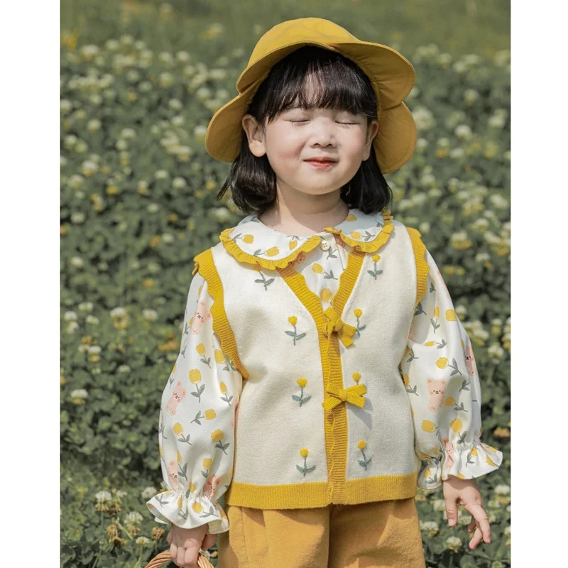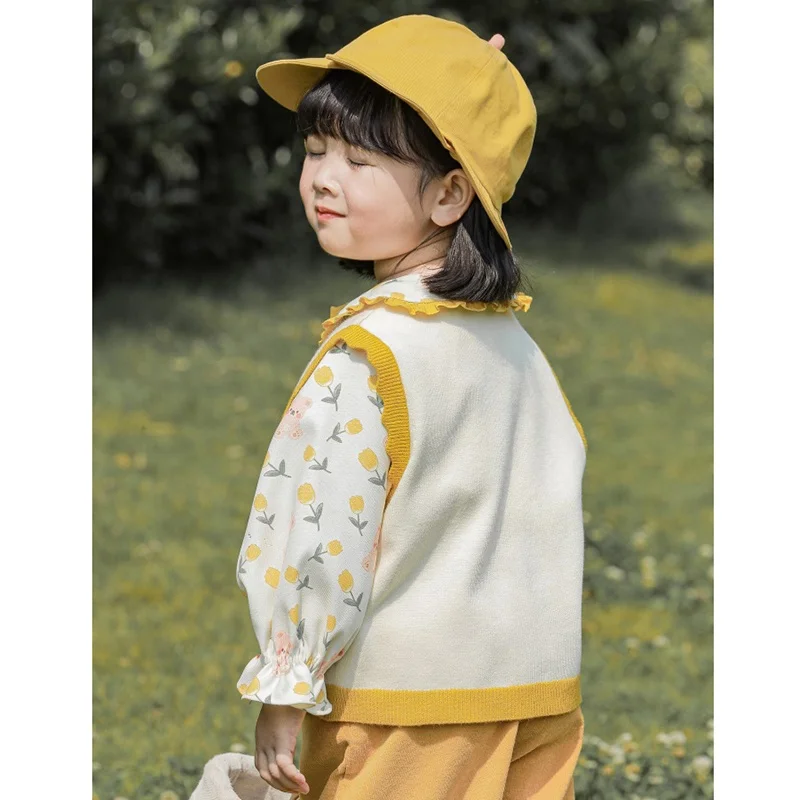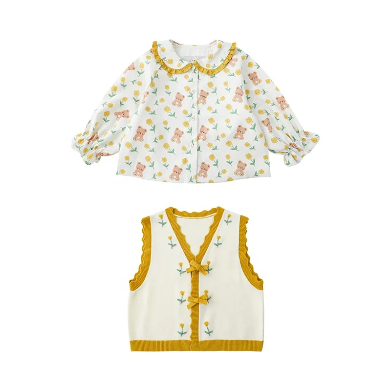 YOEHYAUL Q2452 Fall Baby Girl Clothes Floral Printed Long Sleeve Girls Shirts Knitted Vest Tops for Girls 2 Pcs Clothing Sets