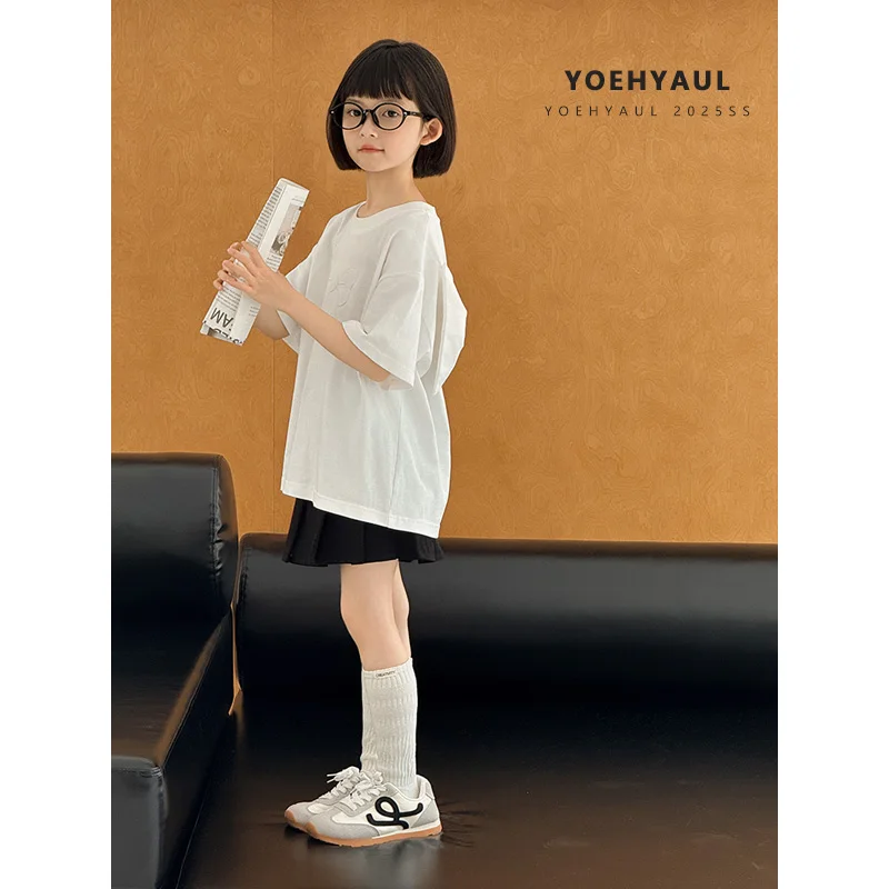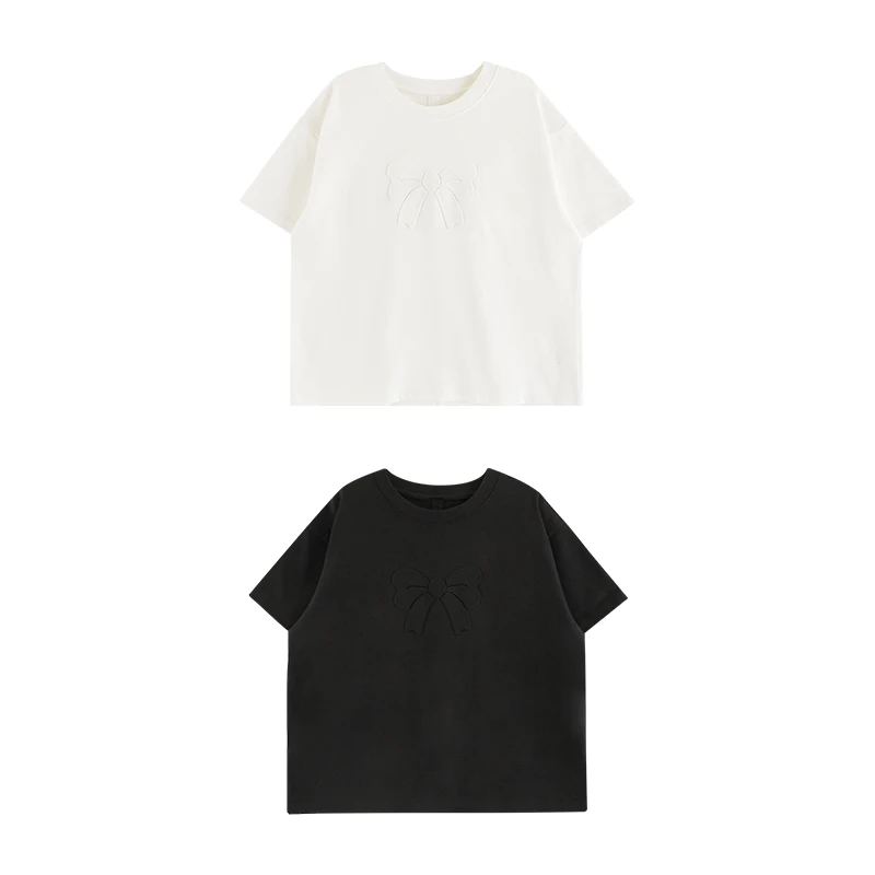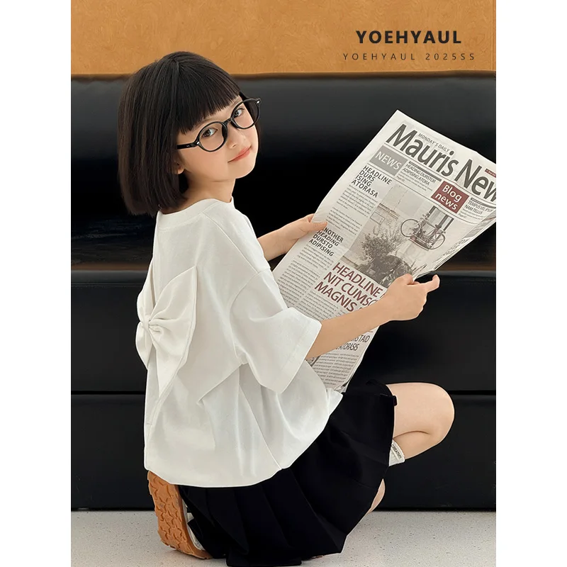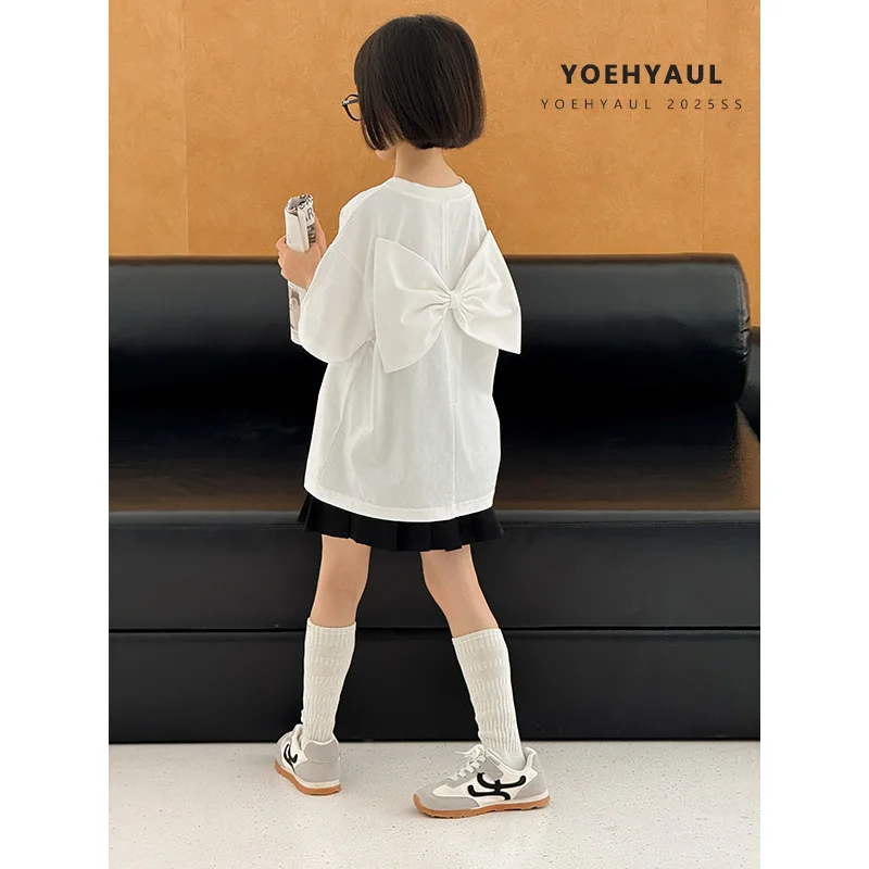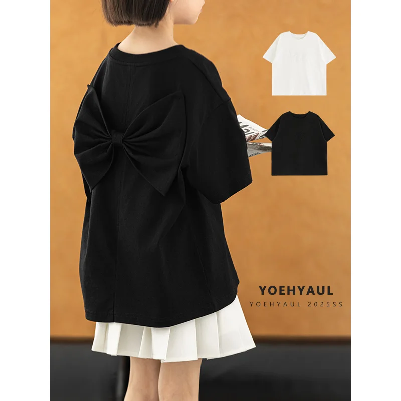 YOEHYAUL CD1713 High Quality Big Girls Tshirts Wholesale White Black Back Bow Teenager Toddler Cotton T-shirt T Shirt for Kids