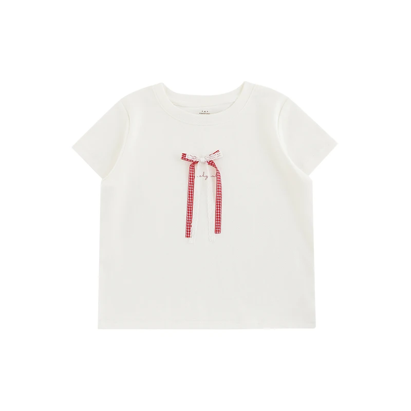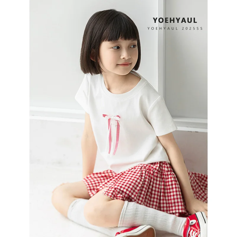 YOEHYAUL CD1655 Beige Big Girls Toddler Cotton T-shirt t Shirt for Kids Casual Soft Teenager Teens t Shirts with Bow