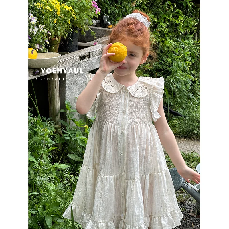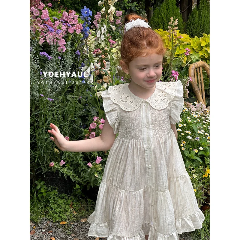 YOEHYAUL 25127 Customized Factory Summer Peter pan Collar Fly Sleeve Girls Dresses Cotton Elastic Ruffled Lace Dresses for Kids