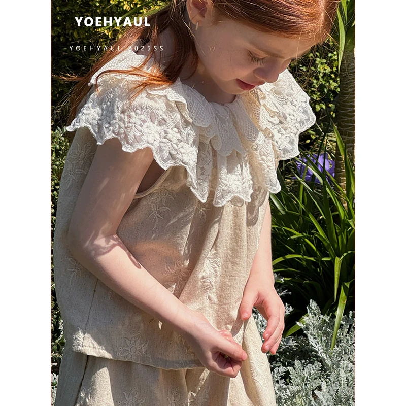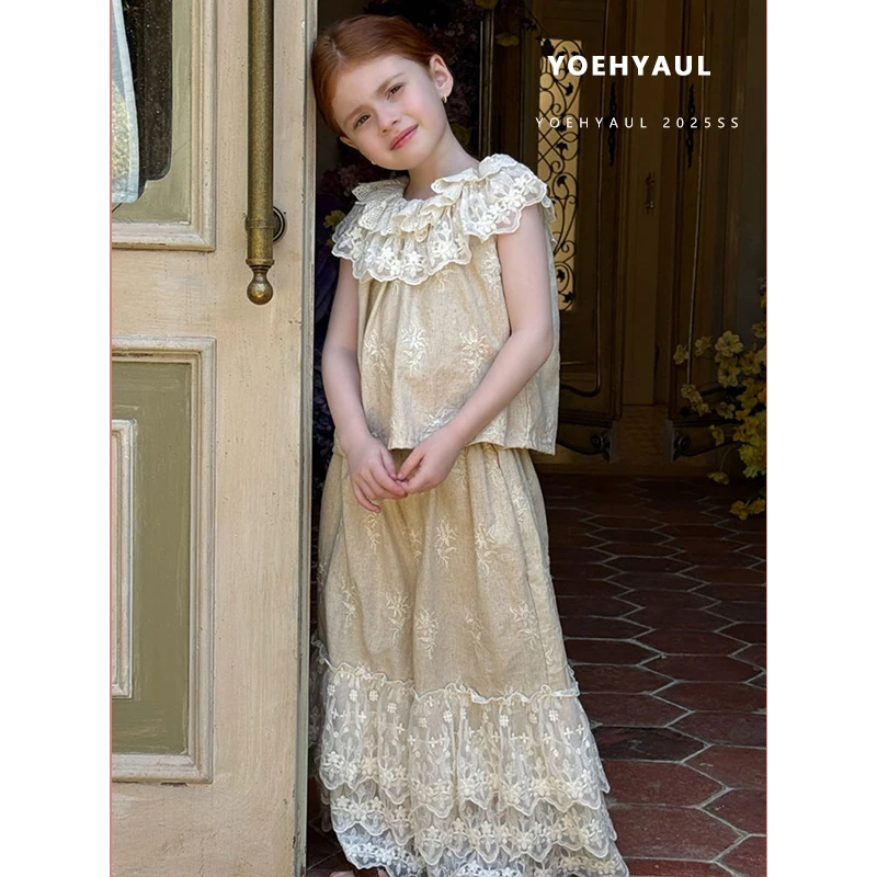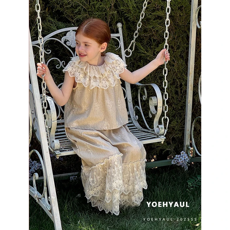YOEHYAUL 25102 Summer Girls Sleeveless Ruffled Neck Linen Top Wide Leg Pants Set Lace T-shirt Embroidered Lace Pants for Kids