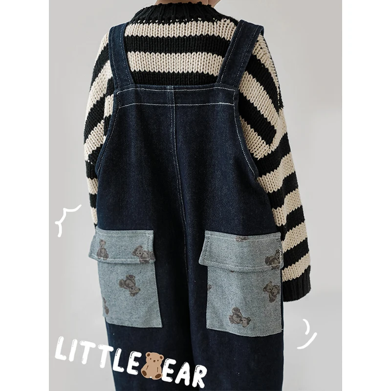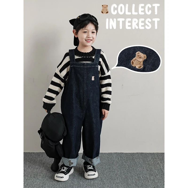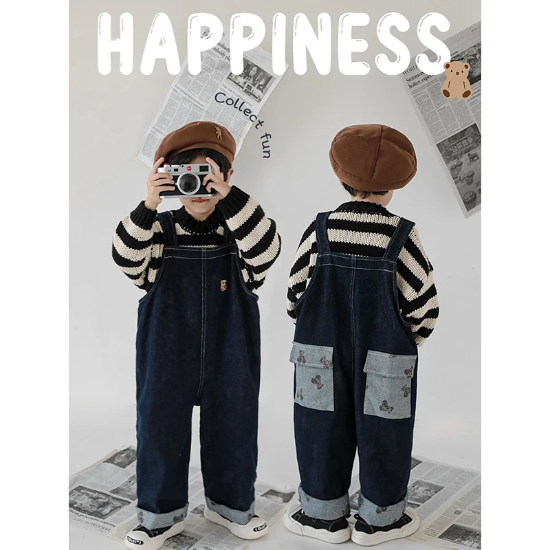 Boys' Bear Fold-Over Printed Embroidered Adjustable Denim Overalls for Autumn New Children's Handsome Trousers