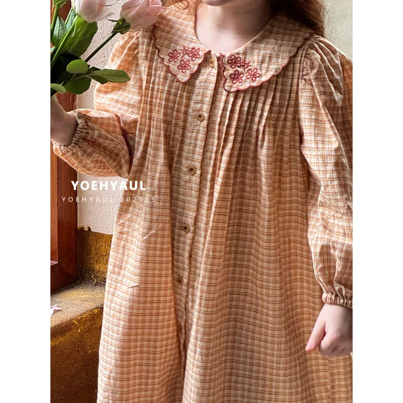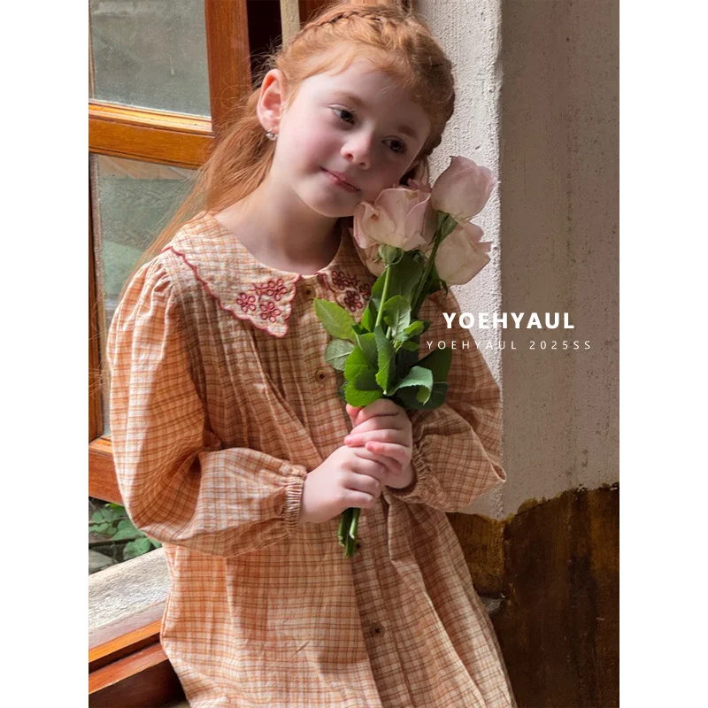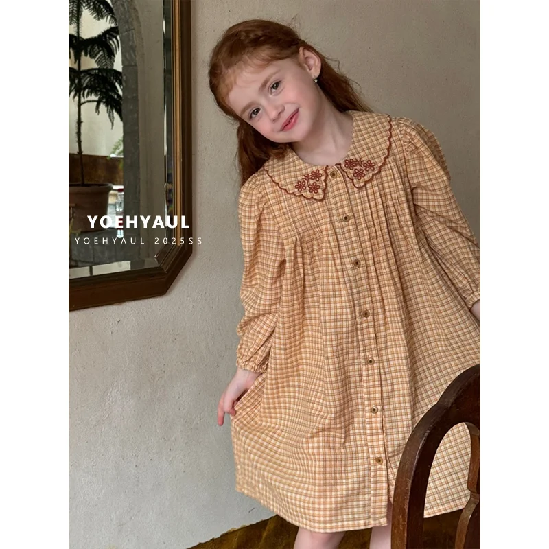 YOEHYAUL 25166 Ruffle Embroidered Plaid Dress Girl Knee Length Yellow Plaid Long Sleeve Cotton Dress Girl Dress Child