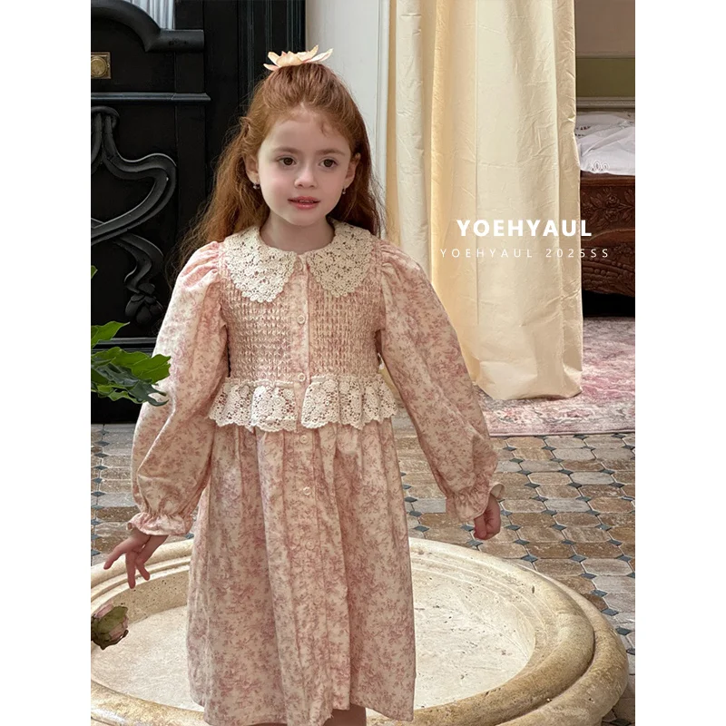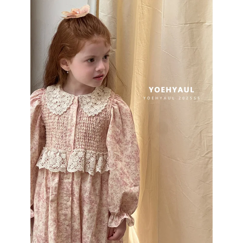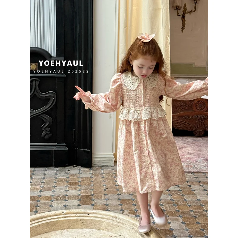 YOEHYAUL 25153 Autumn Long Sleeve Children's Cotton Dress Flower Print Lace Embellishing Wrap Dress Peter Pan Collar Girls Dress