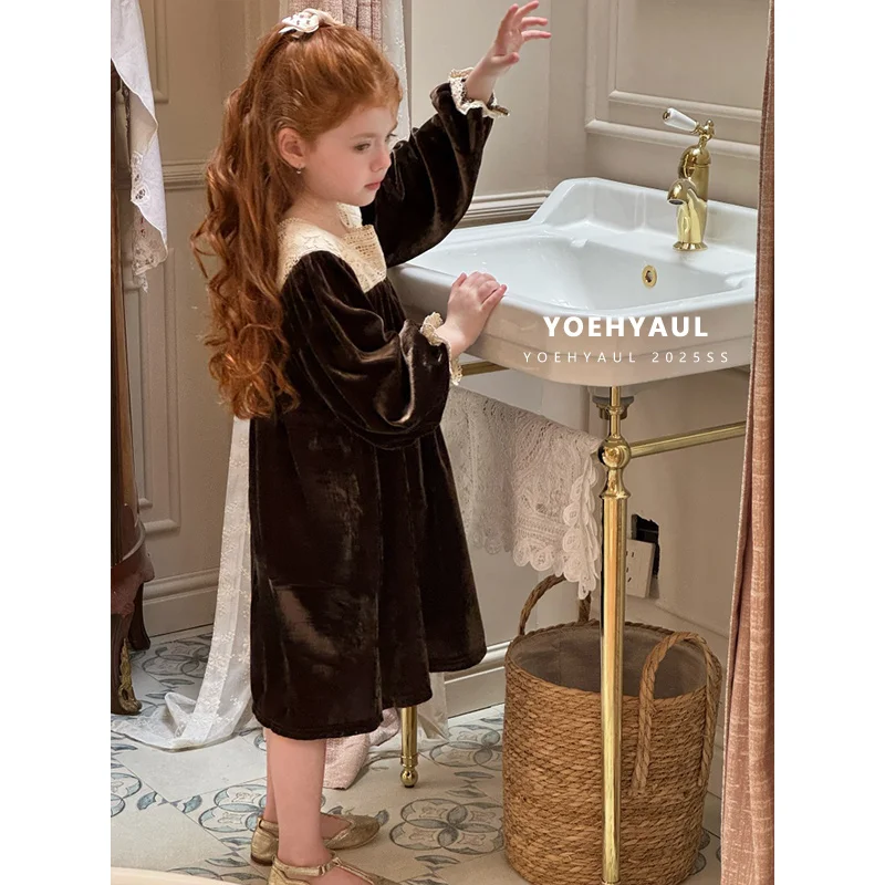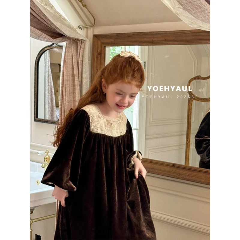 YOEHYAUL 25173 Children's Embroidered Square Neck Velvet Dress Girls Lace Stitching Black Loose Long Sleeve Dress for Kids
