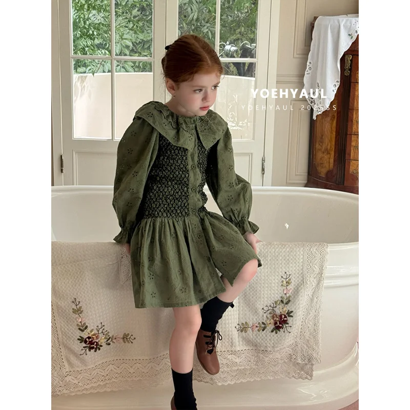 YOEHYAUL 25167 Autumn Embroidered Hollow Floral Dress for Girls Green Knee-High Short Dress Lace Baby Collar Cotton Dress