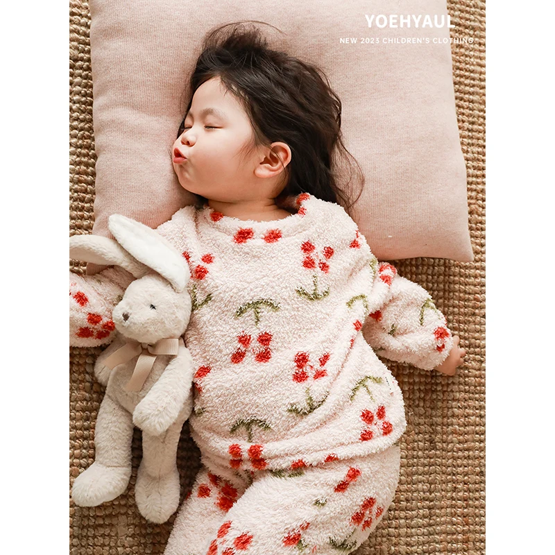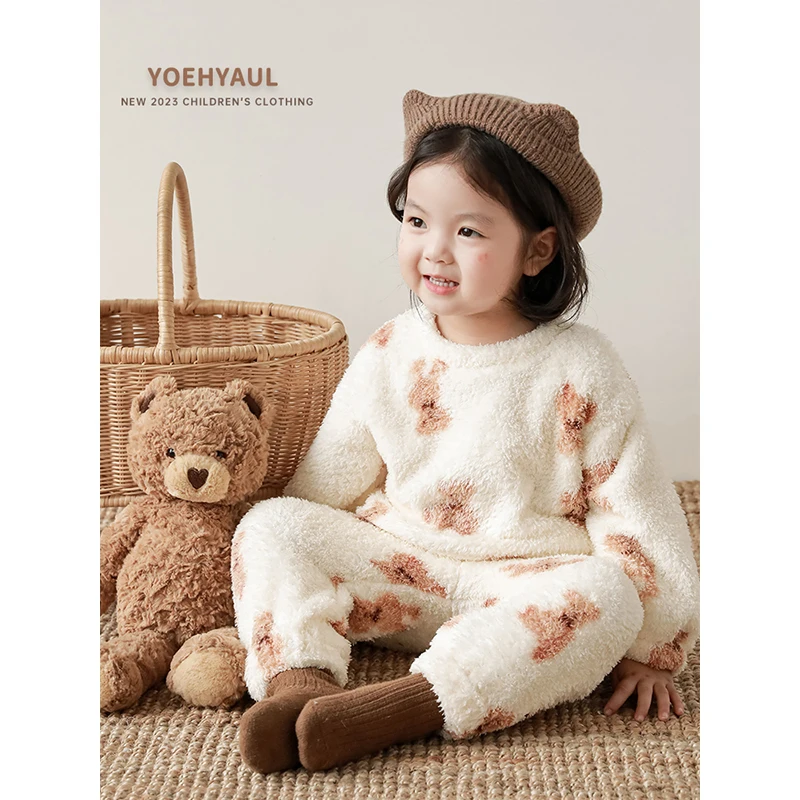 YOEHYAUL Girls Winter Casual Homewear Set Children's Vitality Cute Cartoon Plush Round Neck Pajamas Two-piece Set
