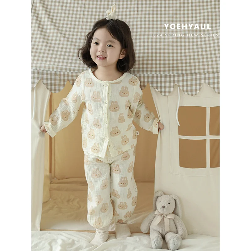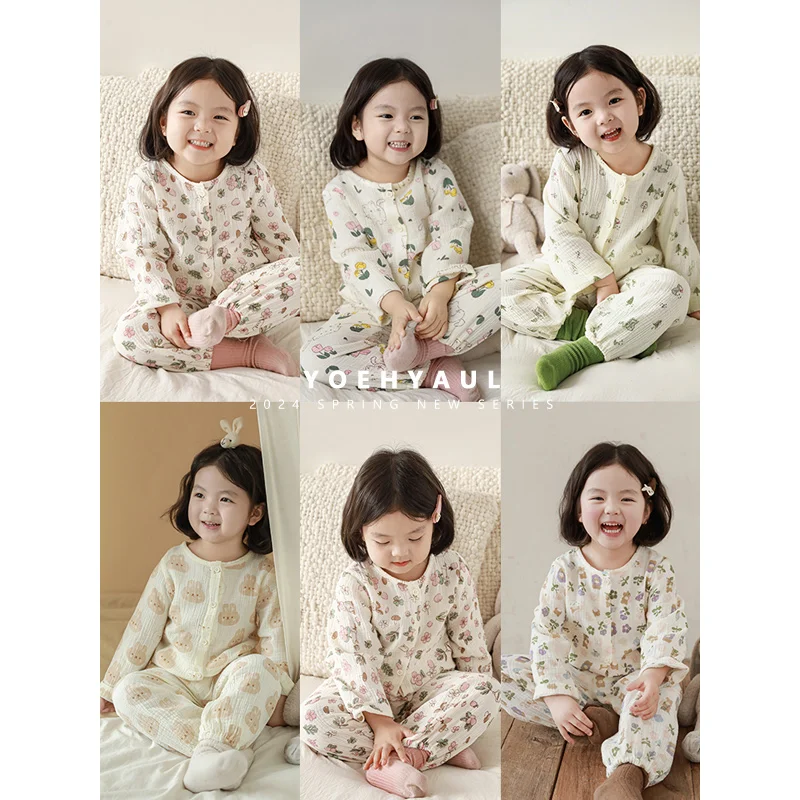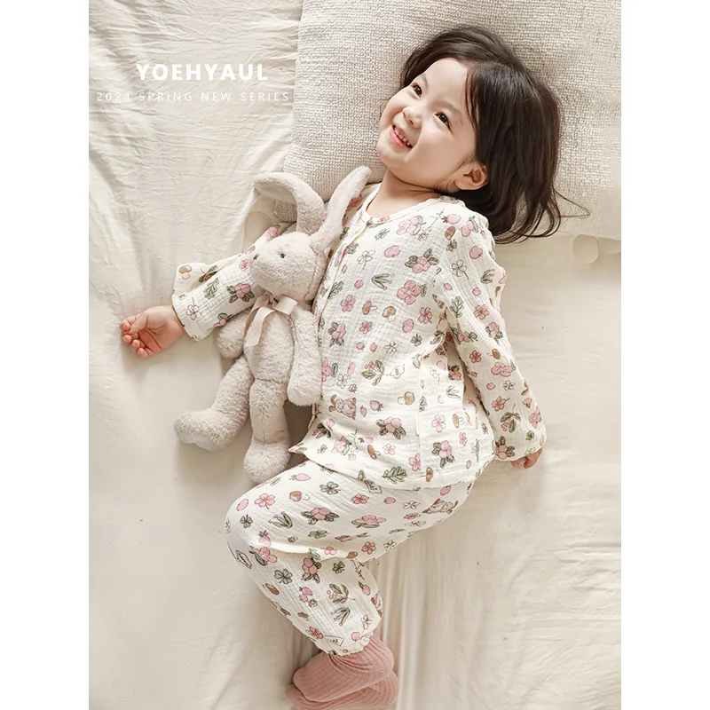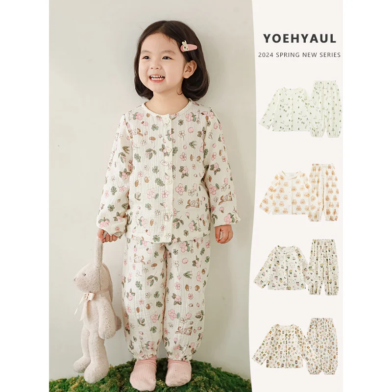 YOEHYAUL Girls Forest Print Home Wear Set 2026 Spring New Simple Round Neck Casual and Comfortable Pajamas Two-piece Set