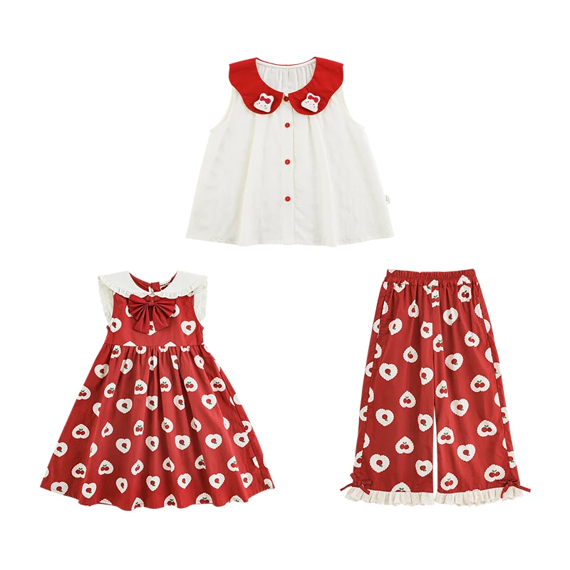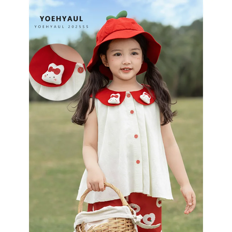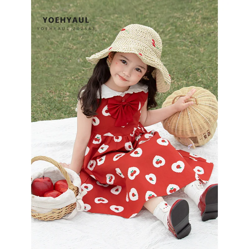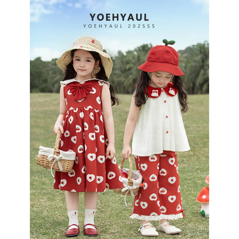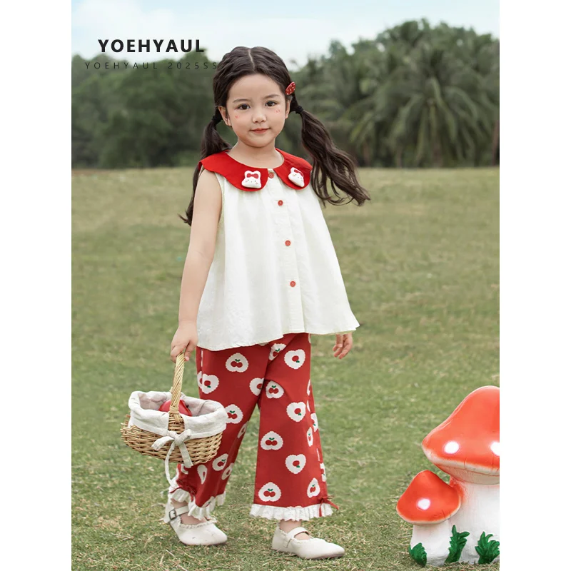 YOEHYAUL X4951 Cherry Print Girl Two Piece Clothing Sets 6-7 Years Cotton Sleeveless Tank Top and Pants Summer Dresses for Girls