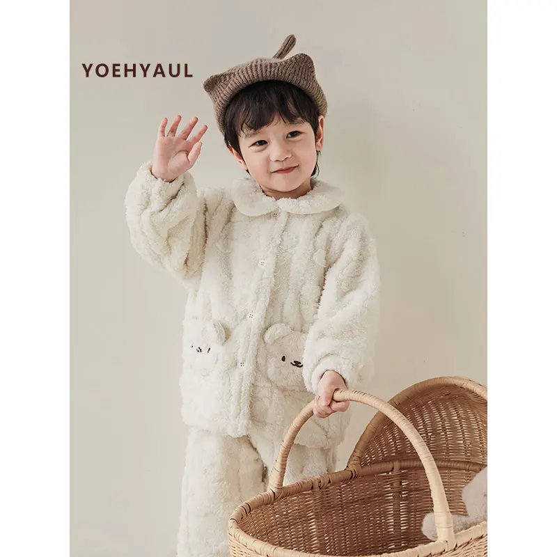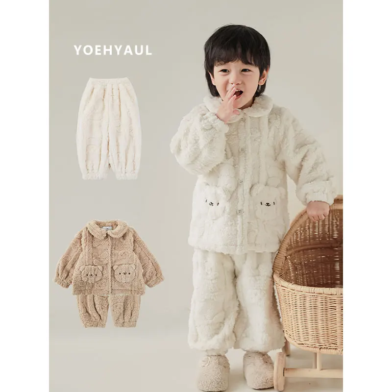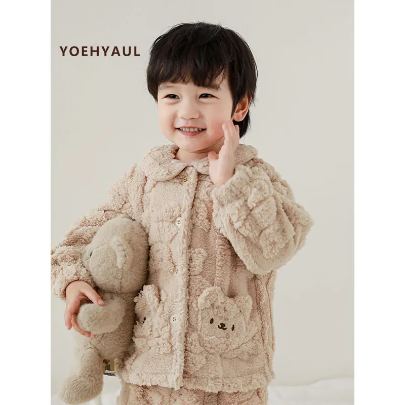 YOEHYAUL Boys' Bear Jacquard Plush Home Clothes Set Autumn Winter Children's Lapel Cute and Warm Tighten Foot Pajamas