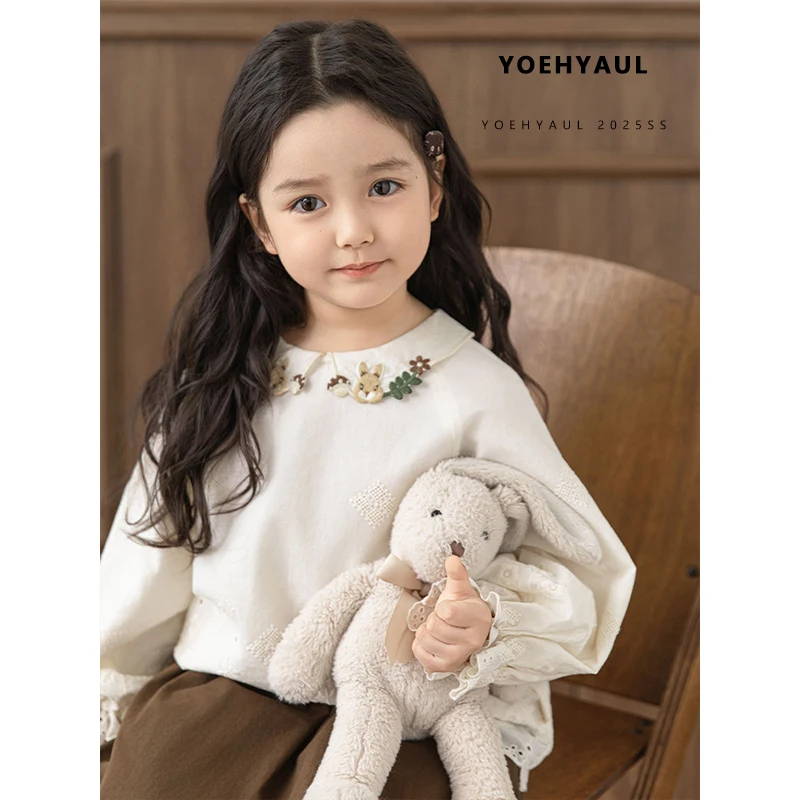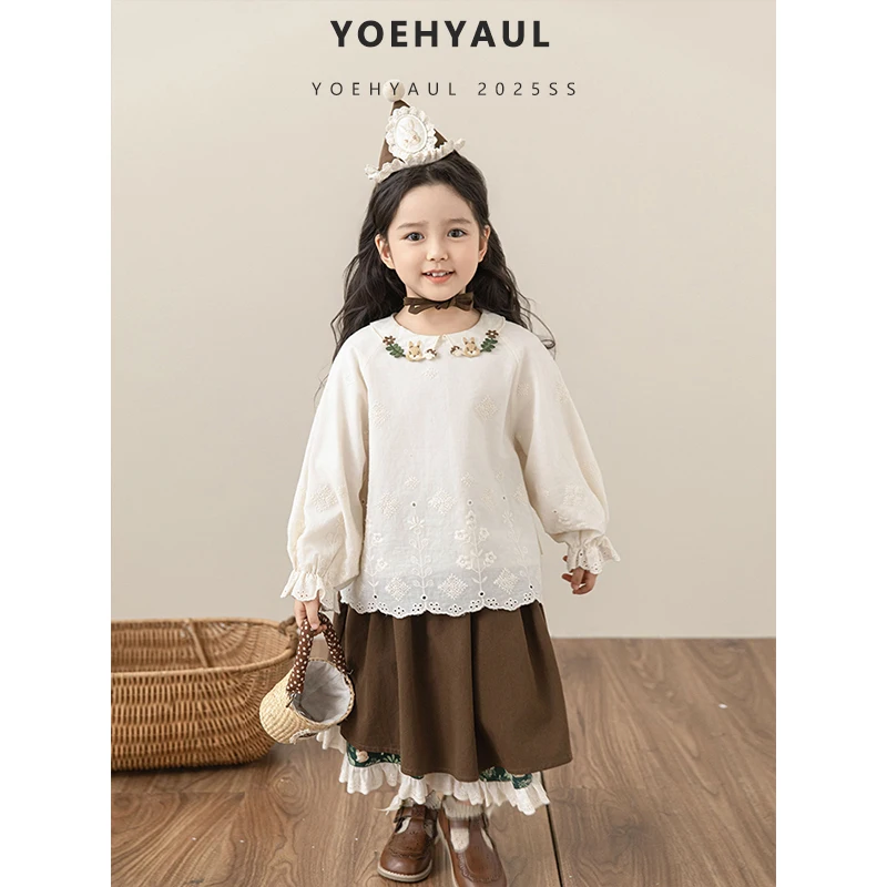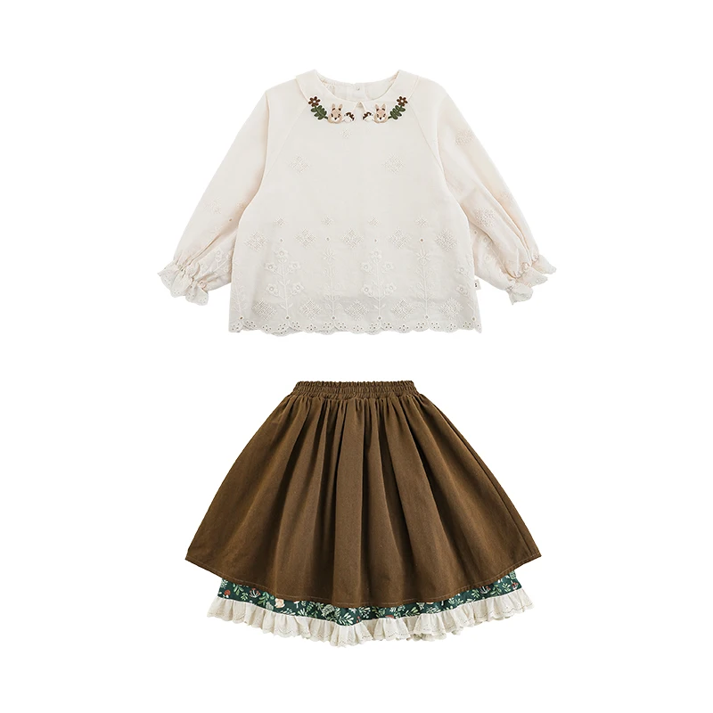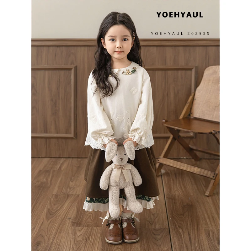 YOEHYAUL C3141 Elegant Girls Two Piece Skirt and Top Set for Girls 100% Cotton Long Sleeve Shirt Outfit for Kids Girl