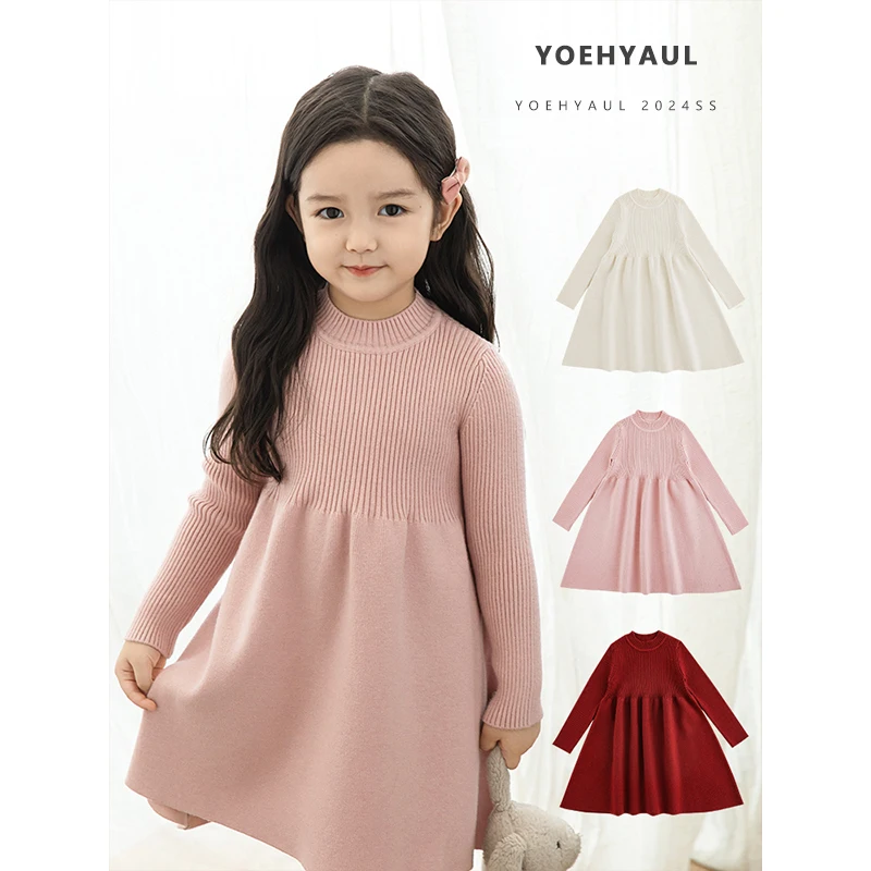 YOEHYAUL D3472 Anti-pilling Kids Knit Dress Long Sleeve Winter Dress for Kids Toddler Solid Turtleneck Girls Sweater Dress