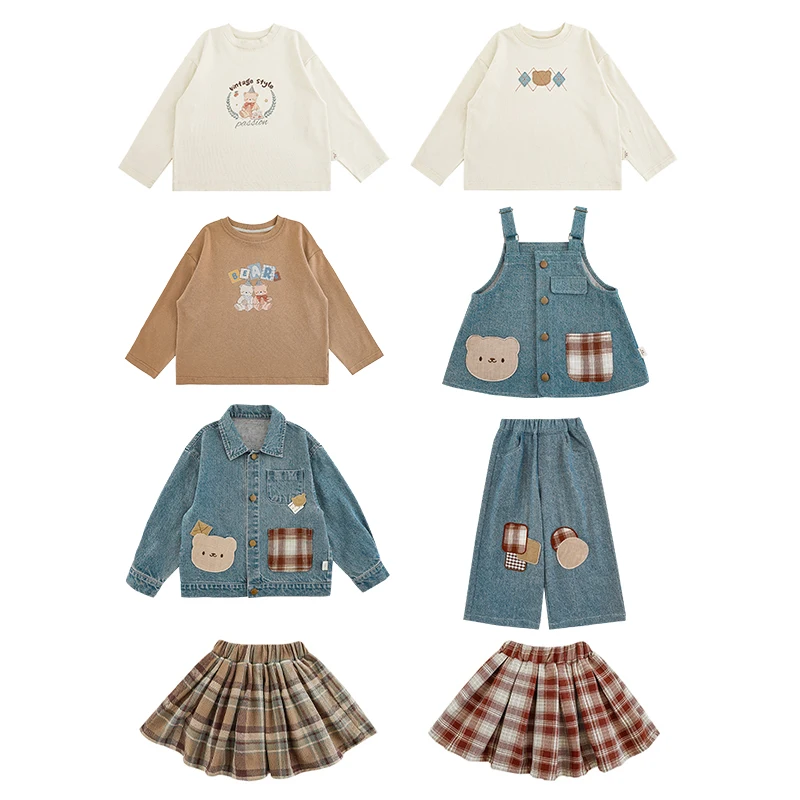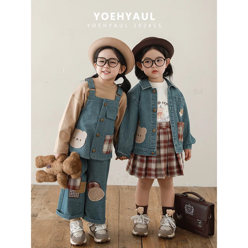 YOEHYAUL Q3447 Cartoon Bear Series Kids Girls Outfit Sets Girls Denim Jacket Jeans Long Sleeve Shirt Clothing Sets for Girls