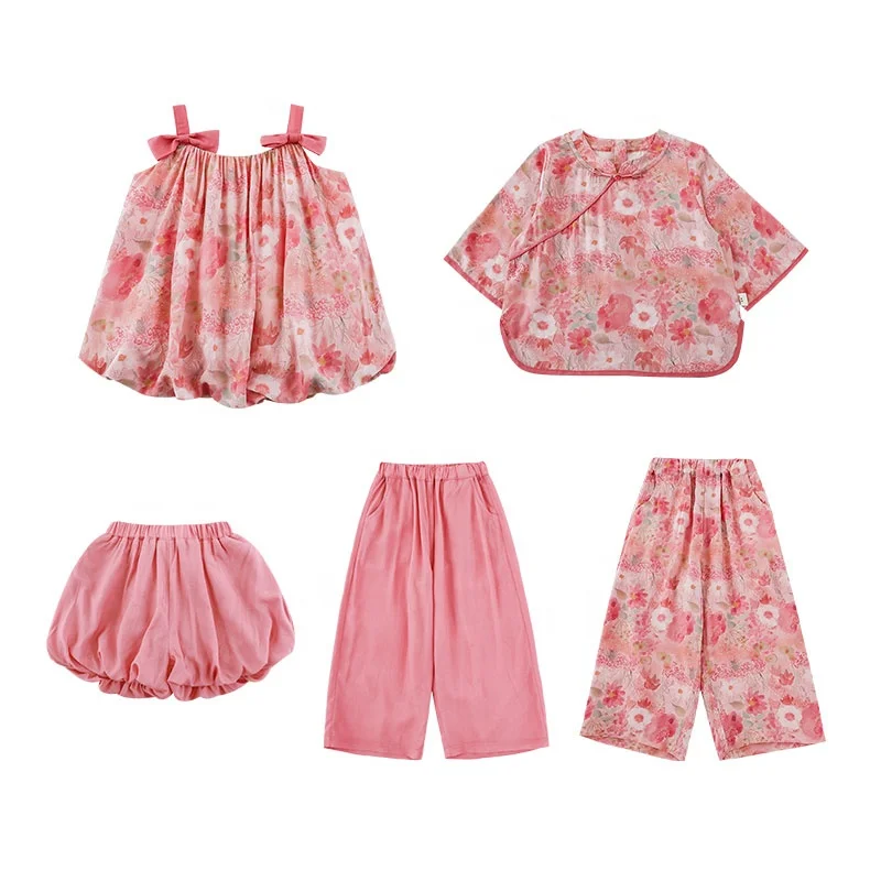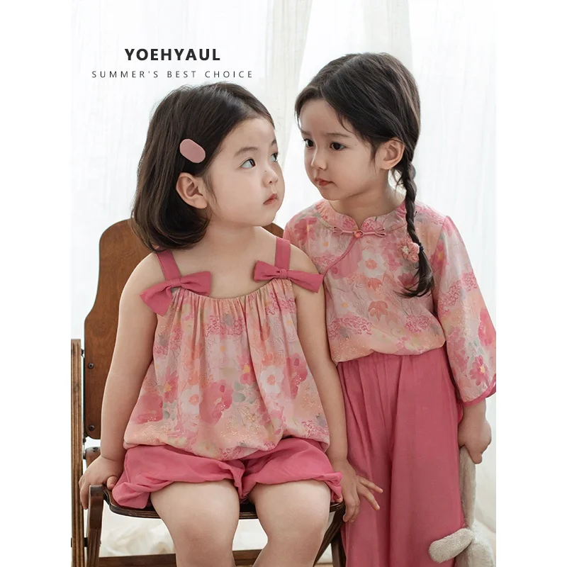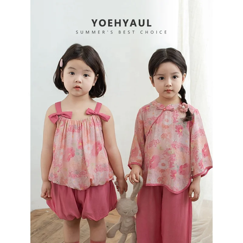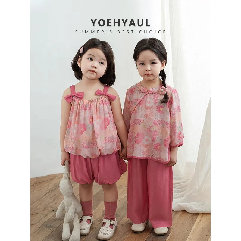 YOEHYAUL Summer Floral Suit Pattern Shorts Summer Baby Girls Sets High Quality Wholesale Pure Cotton Kids Girls Pink Floral Set