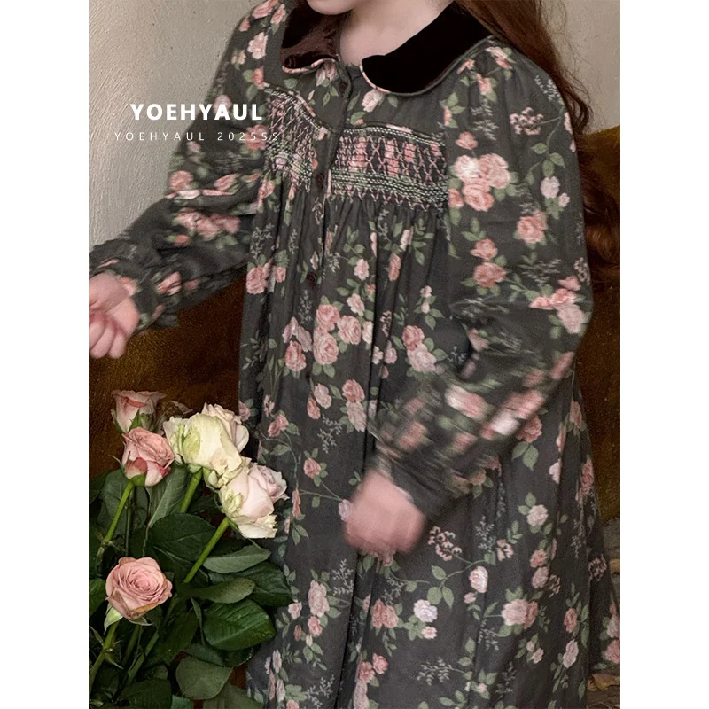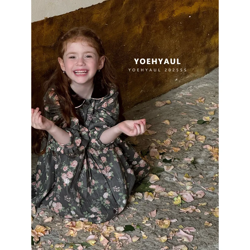 YOEHYAUL 25180 Kids Vintage Floral Print Dress 100% Cotton Girl Dress Long Sleeve Peter Pan Collar Elegant Dress for Toddlers