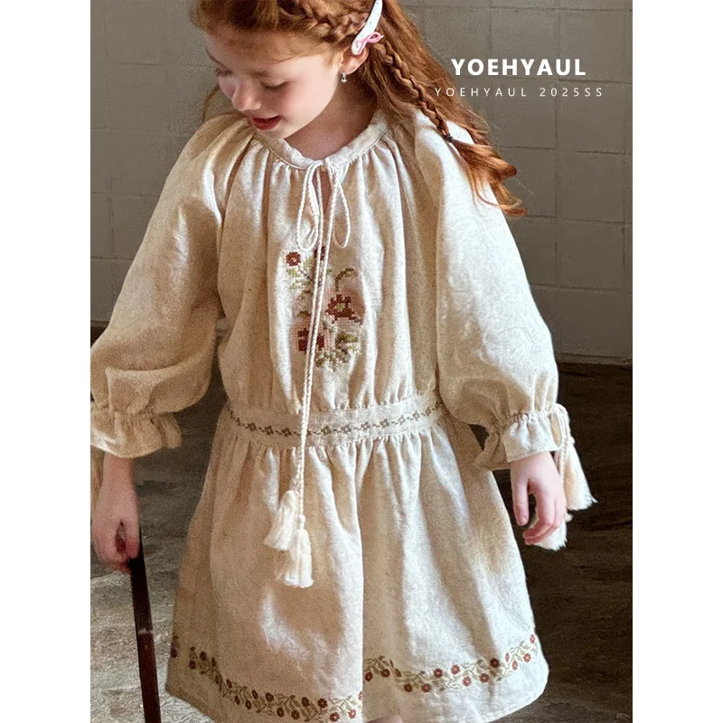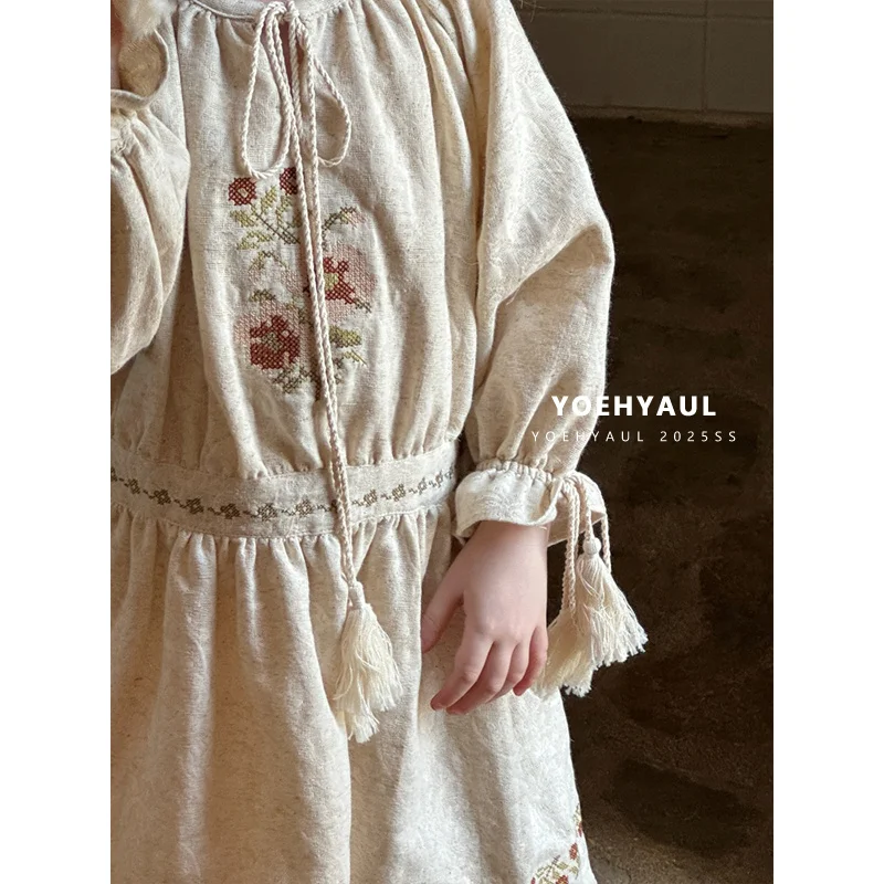 YOEHYAUL 25175 Bohemian Style Girl Dress Flower Embroidery Drawstring Collar Cuffs Girl Knee-length Dress Baby Girl Dress Child