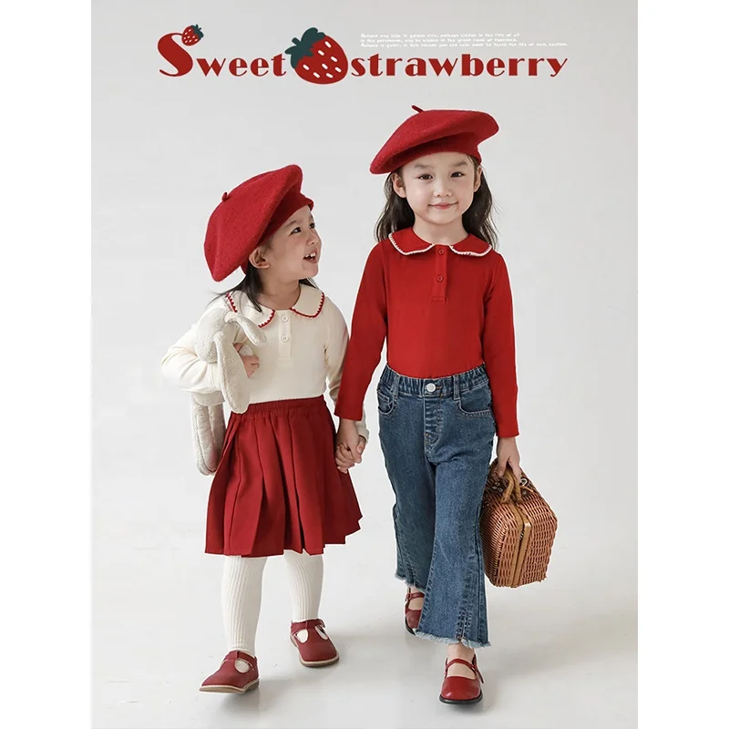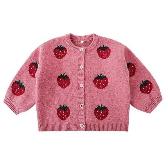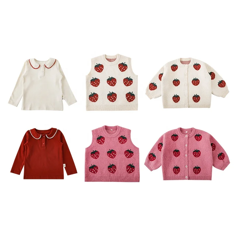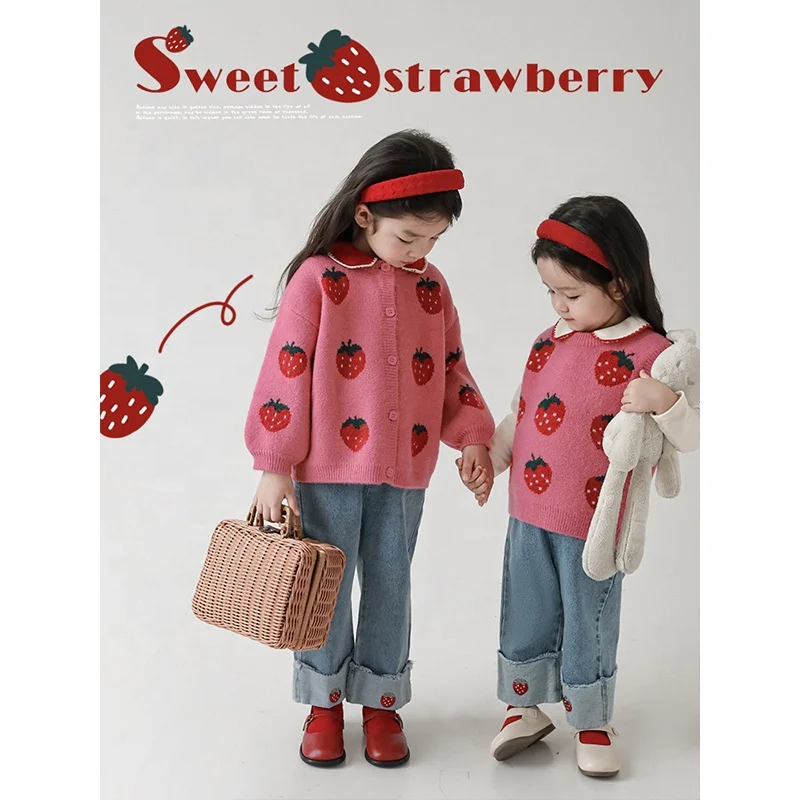 YOEHYAUL Q2824 Autumn New Arrival Cardigan Sweater Baby Girls Strawberry Vest Wholesale Kids Girls Pink Sweater Sets