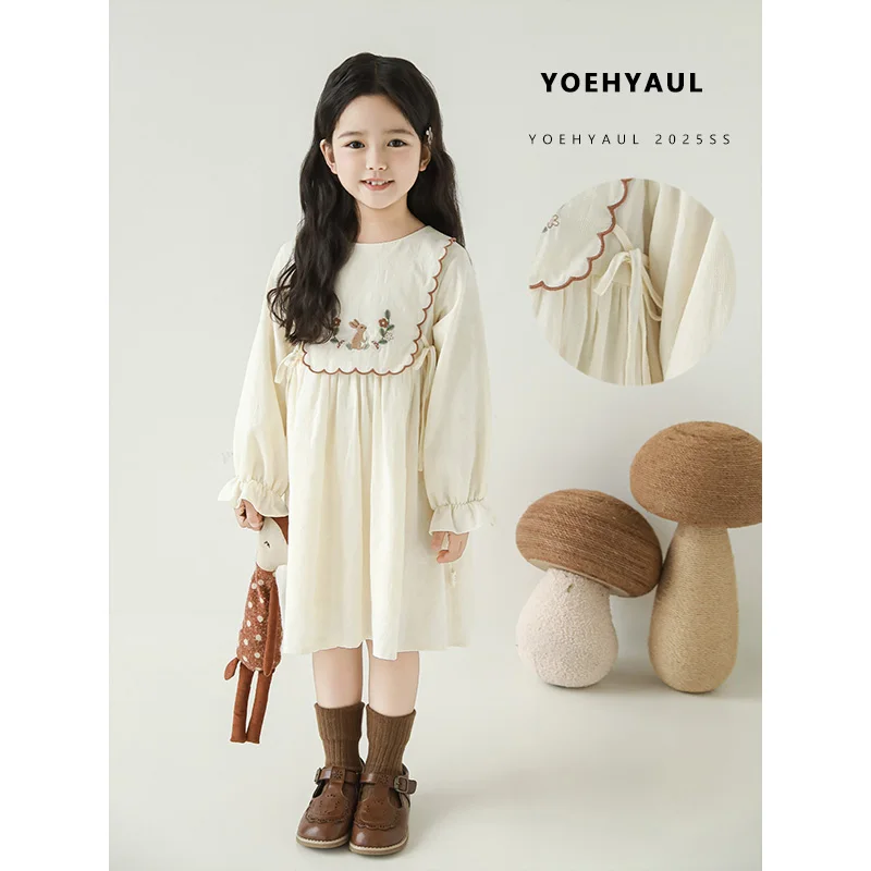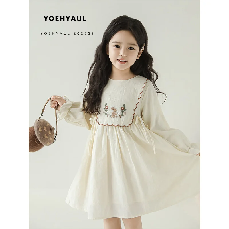 YOEHYAUL Q4259 Autumn New Long-sleeved Kids Cotton Dress Tie Front Embroidered Flowers Rabbit Sweet Elegant Girls' Dresses